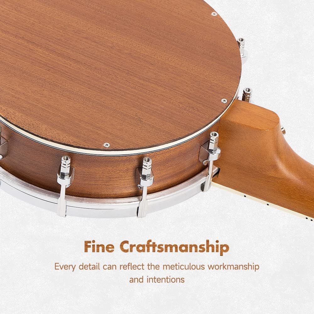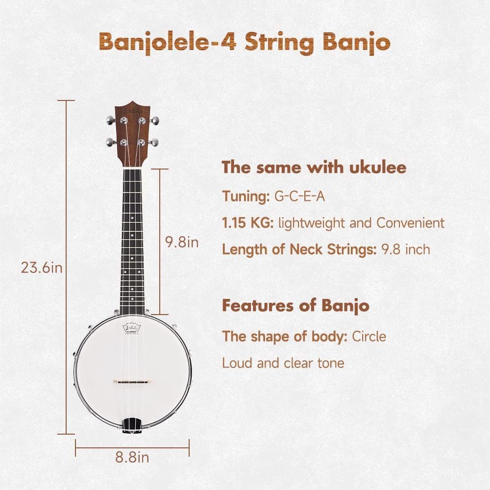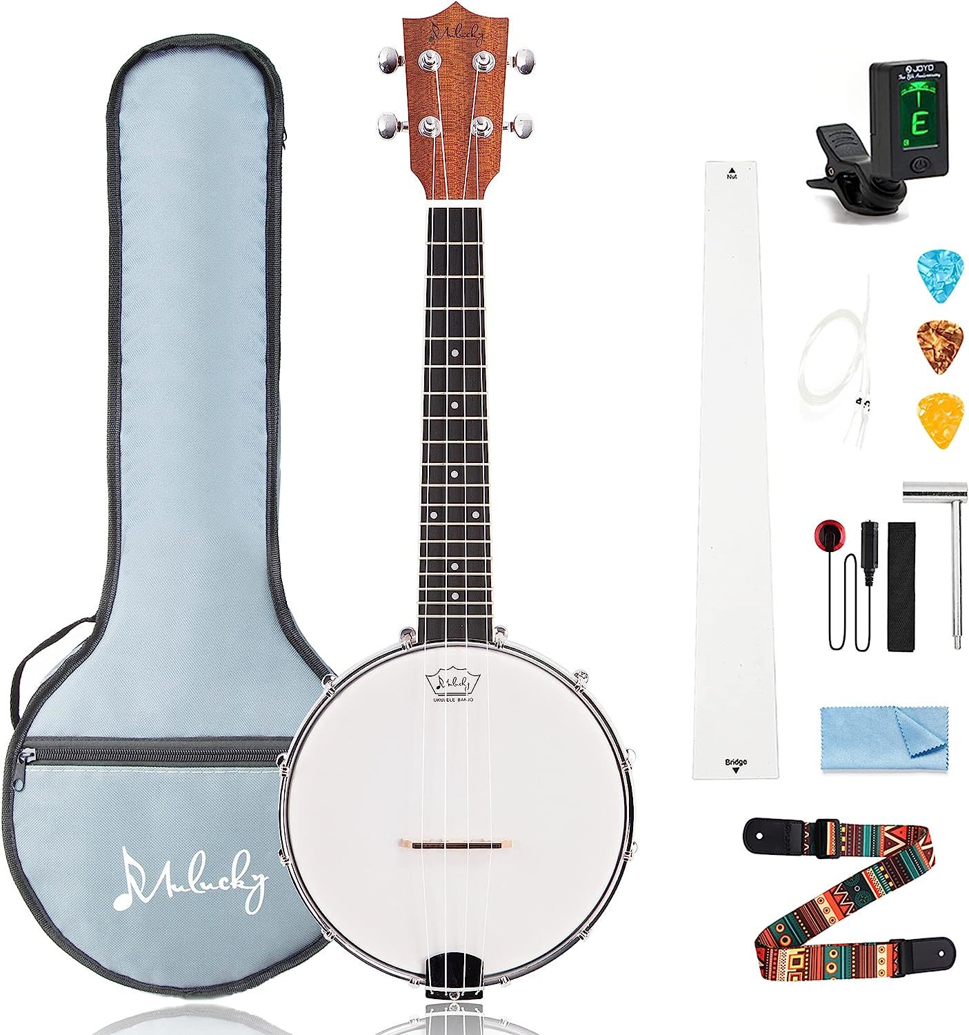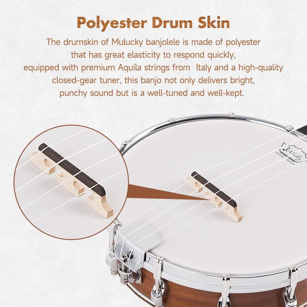 ??Portable Size? - The 23 inch banjolele is perfect for musical travel. Lightweight, suitable for parties, courses, etc. The mini banjo is easy to use, very suitable for beginners, and economical ? ?Polyester Drum Skin? - The drumskin of Mulucky banjolele is made of polyester that has great elasticity to respond quickly, equipped with premium Aquila strings from Italy and a high-quality closed-gear tuner, this banjo not only delivers bright, punchy sound but is a well-tuned and well-kept. ? ?Comfort in Hand?- The 3mm motion at the 12th fret is very comfortable when pressed. Adjusting the truss rod can better balance the tension caused by the strings or climate change, and set the perfect string height to meet different needs ? ?Premium Sapele?- The Sapele xylophone body with beautiful wood grain is hard, not easy to warp or corrode, making the banjo durable. The anti-corrosion chrome-plated pegs can stand the test of time, and the 15:1 transmission ratio ensures string pitch ? ?Warranty Service? - We are a professional banjo uke supplier, committed to the spirit of music and supplying competitive instruments. If you have any dissatisfaction with this banjolele, please contact us for a full refund or a replacement it