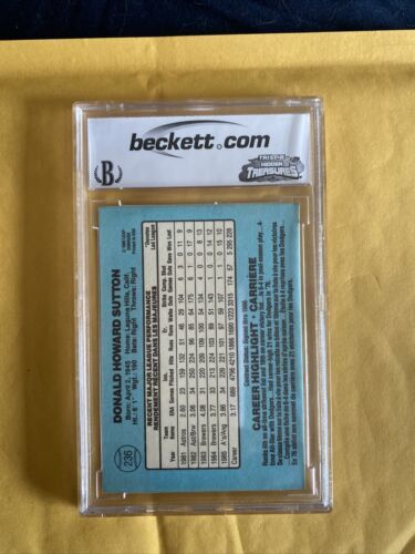 This is a rare and highly sought-after sports trading card featuring Don Sutton, a legendary baseball player from the California Angels team. The card was manufactured by Donruss/Leaf in 1986, as part of their base set. Its card number is #236 and it is in near mint condition, graded BCCG 9.