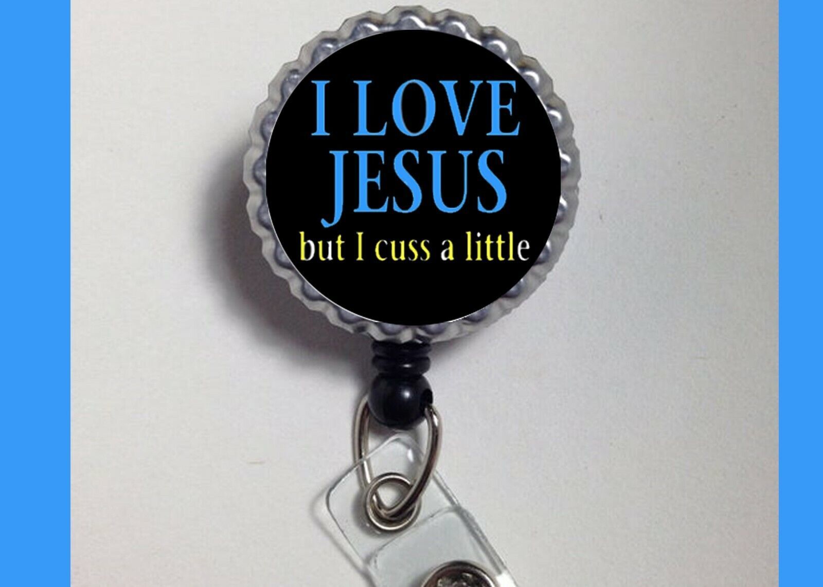 I love Jesus But I cuss a little work Retractable Reel ID Badge holder Nurse Cna