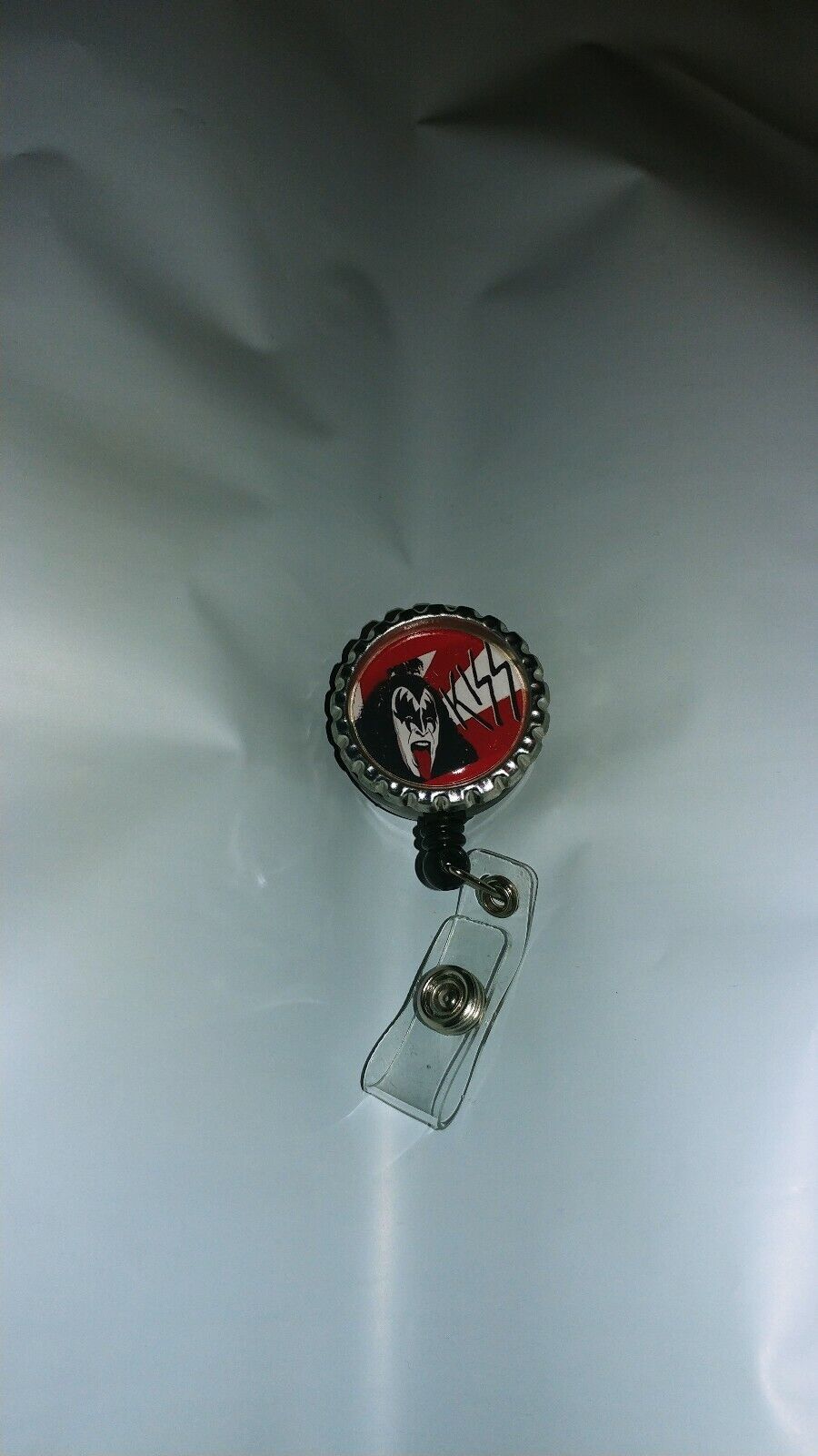 THis IS VERY CUTE BLACK AND SLVER RETRACTABLE BADGE VERY WELL MADE VERY DURABLE ?..1.5 inch round....Kiss