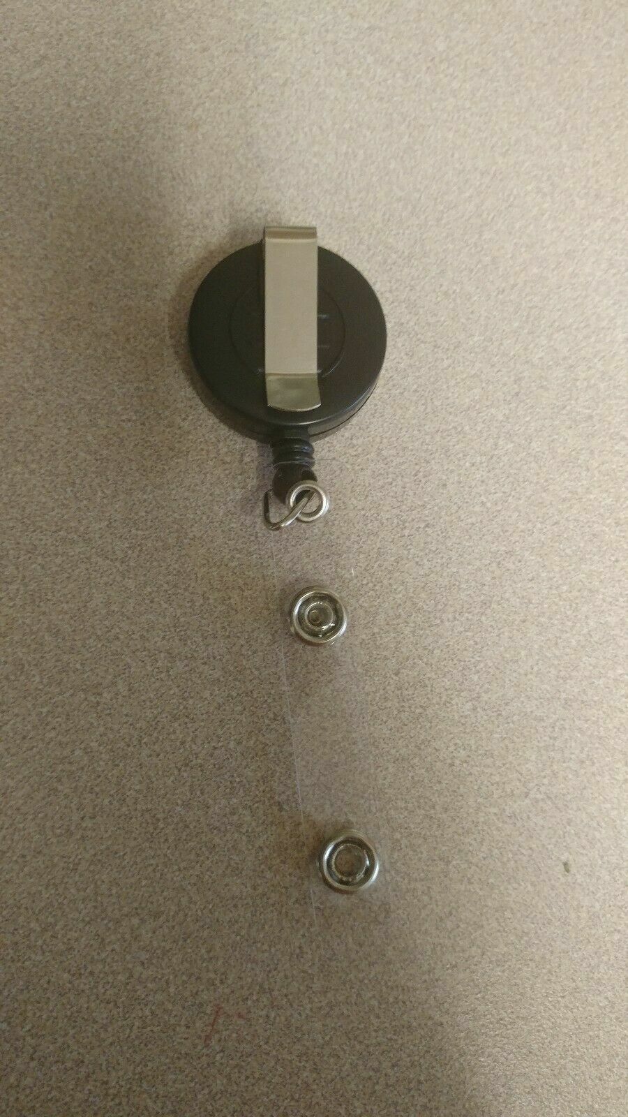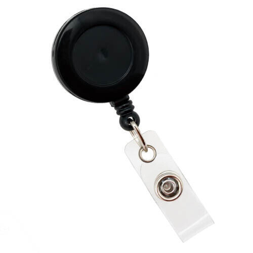 THis IS VERY CUTE BLACK AND SLVER RETRACTABLE BADGE VERY WELL MADE VERY DURABLE ?..1.5 inch round...