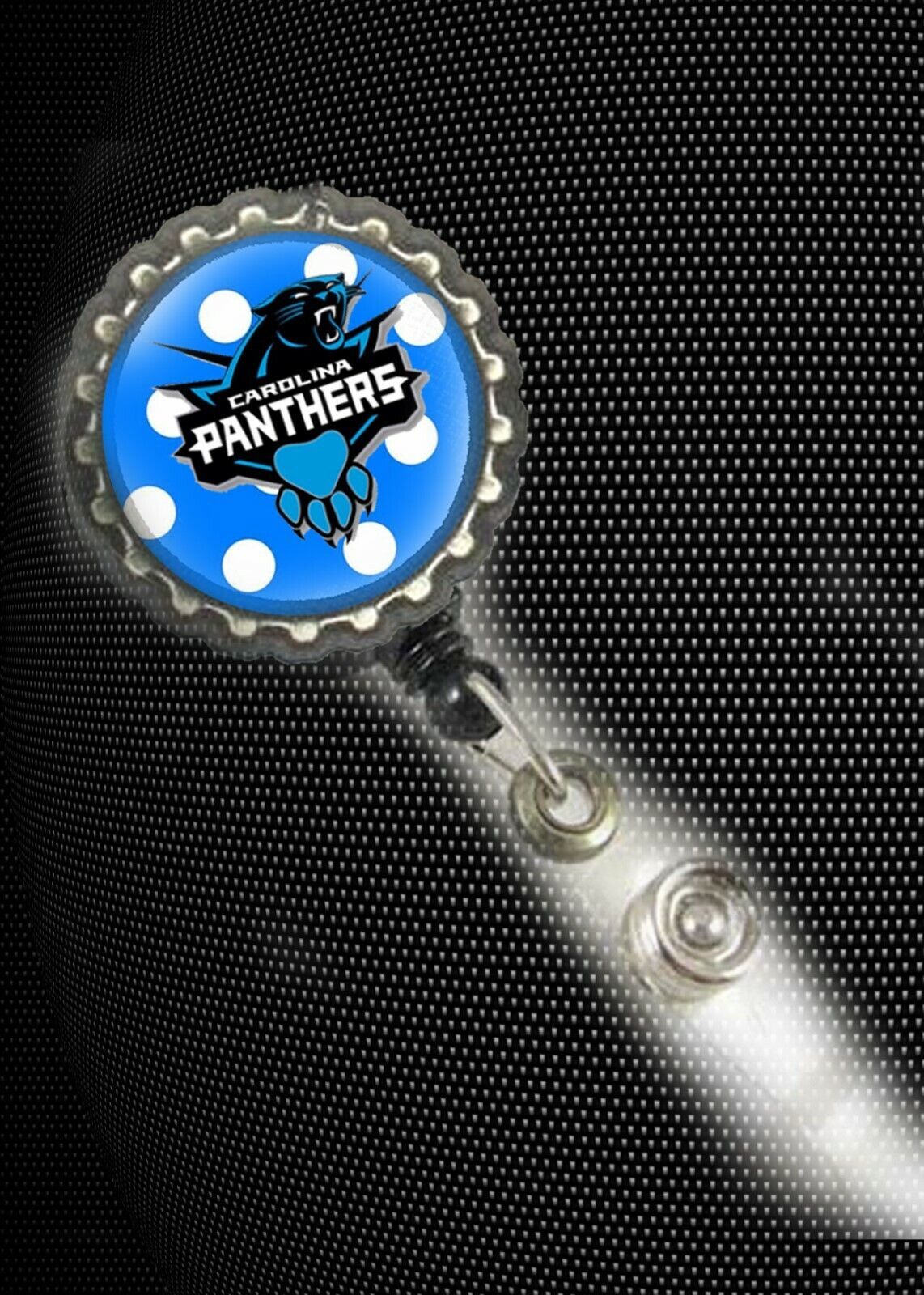 THis IS VERY CUTE BLACK AND SLVER RETRACTABLE BADGE VERY WELL MADE VERY DURABLE ?..1.5 inch round...Carolina Panthers