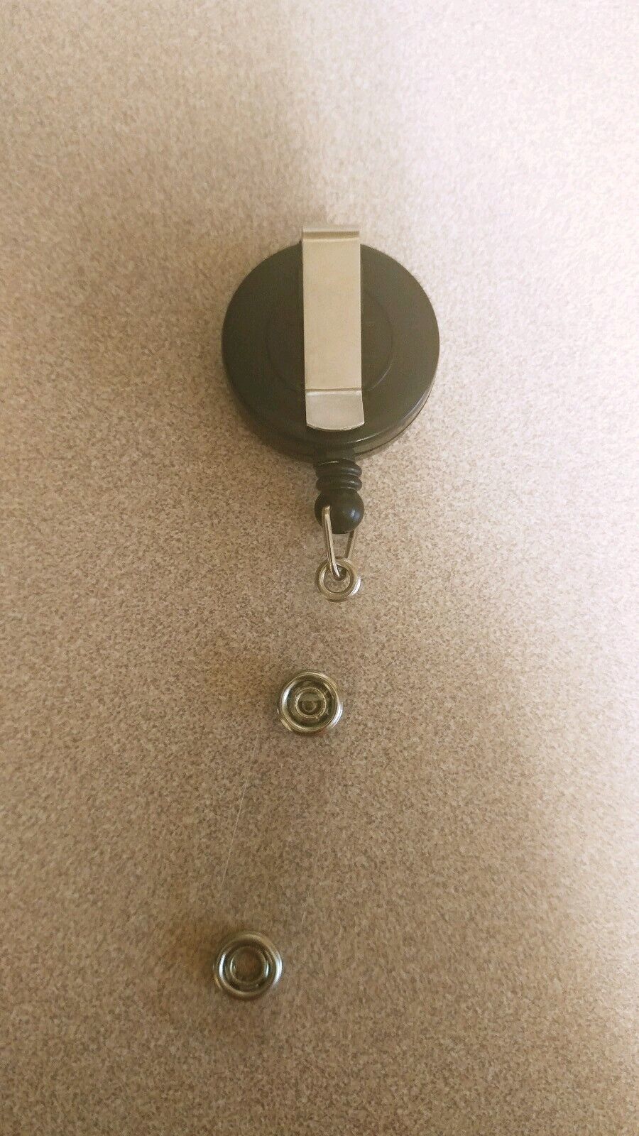 THis IS VERY CUTE BLACK AND SLVER RETRACTABLE BADGE VERY WELL MADE VERY DURABLE ?..1.5 inch round....