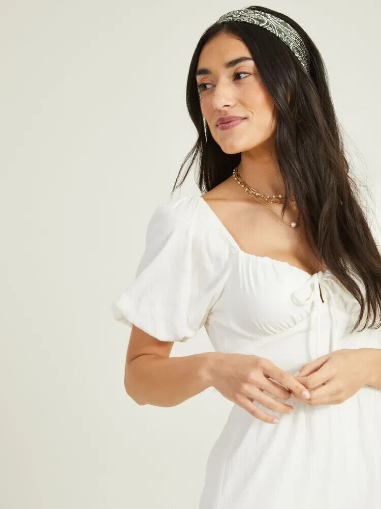 This sweet romper is the perfect staple for any effortless girl's wardrobe! The exaggerated puff sleeves and tie front bodice highlight the dainty breathable feel of this romper. It is the perfect piece to bring to your next vacation; incorporate your style with platform sandals and gold jewelry to complete the look. Fit: Romper Closure: Slip on Short Sleeve Imported 95% rayon / 5% spandex Retail $69.95