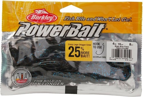 Berkley PowerBait Crazy Legs Chigger Craw Fishing Soft Bait, 4", 8 Count, Black Blue Fleck, 4/0 Offset EWG Hook