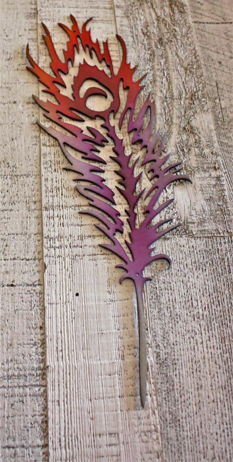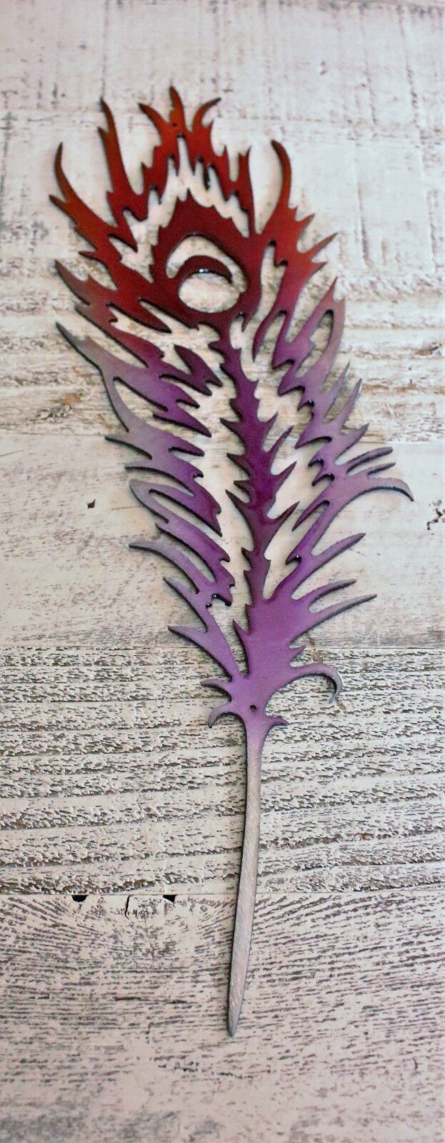 Peacock Feather - Metal Wall Art - Red/Orange & Purple 14" x 4 1/2"
