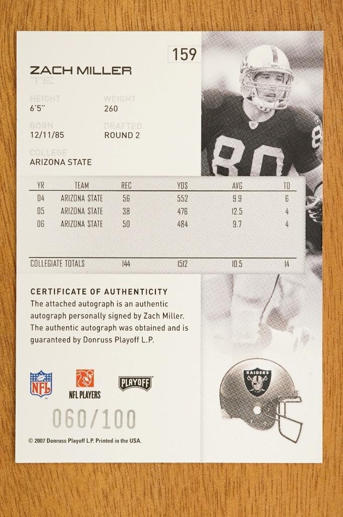 2007 Playoff NFL Playoffs Red Signatures 60/100 Zach Miller #159 Rookie Auto RC