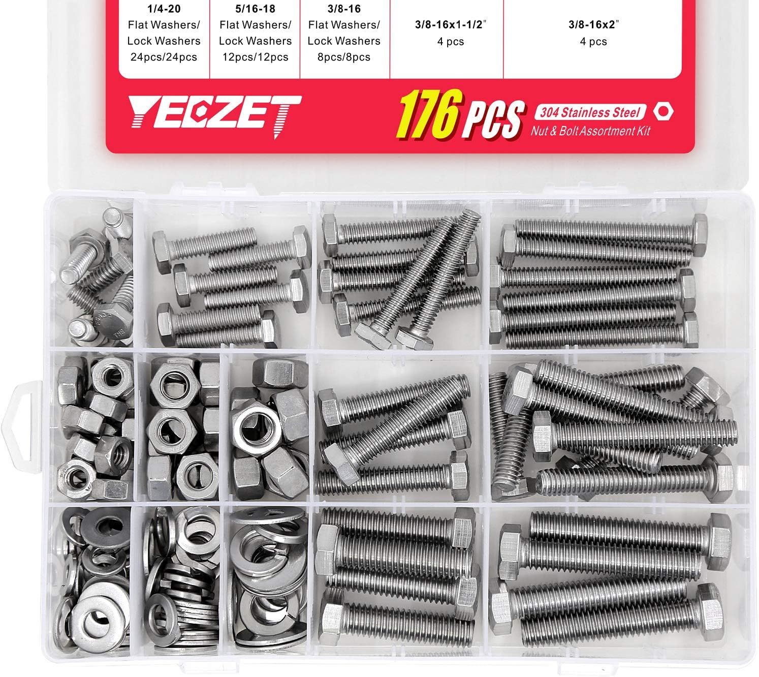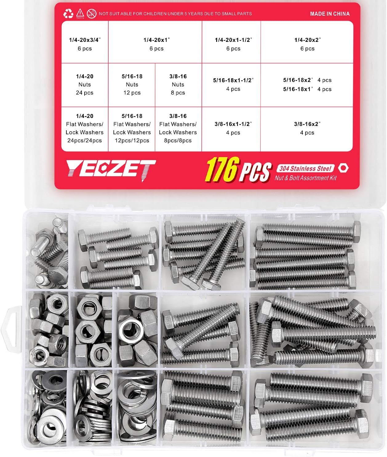 ? HIGH QUALITY TO BE TRUSTWORTHY: 304 stainless steel material, not rust, anti-moisture, anti - oxidation, corrosion resistant, acid/alkali resistance, high hardness. No pollution, Health lead-free environmental protection non-toxic. ? STANDARD SIZE(Tolerance:0.005mm): Uniform force, located in the center of the head with no offset, not easy to slip; Uniform pitch, obvious screw thread, no residual burrs, the set screw threads will be able to get a good grip. ?MANY SPECIFICATION TO BE CHOSEN: 1/4??- 20 x 3/4???1/4??- 20 x 1??? 1/4??- 20 x 1-1/2???1/4??- 20 x 2???5/16??- 18 x 1???5/16??- 18 x 1-1/2???5/16??- 18 x 2???3/8??- 16 x 1-1/2???3/8??- 16 x 2?? , total 176 pcs, Includes 9 Most Common Sizes. ? PLASTIC HEAT SEAL PACKAGING: Practical and convenient of packing box, All of screws and nuts are packed in a durable and sturdy box, this box can be use for a storage box. ? THE WIDE APPLICATIONS: Door handle, faucet, light fixture, knobs, locks and toys, , plumber and other small repairs around the shop, garage or home; and all kinds of precision machinery, classified instruments, electronic products, household appliances, communication products.