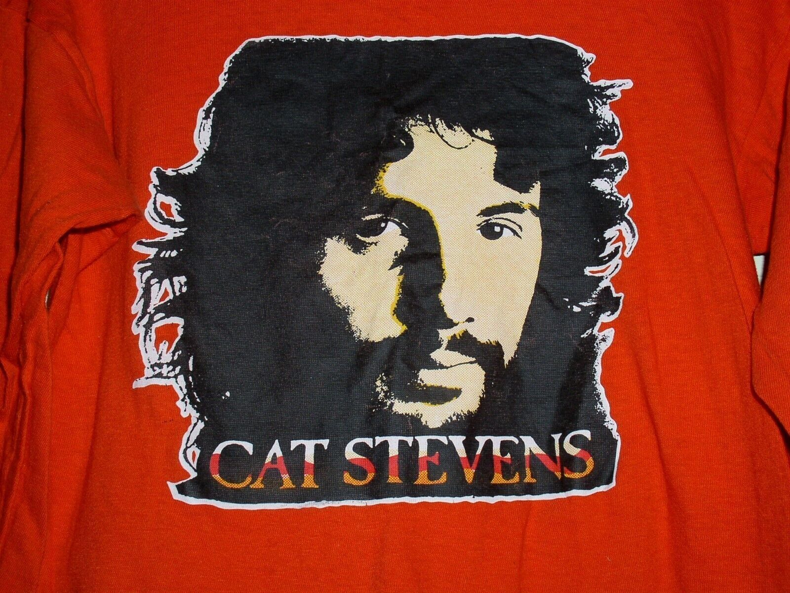 This is a vintage long sleeve shirt entitled, "Cat Stevens". This is a vintage iron-on transfer. This very scarce shirt label reads: Johnstown. Care tag is underneath. There is no back printing on the shirt. Sleeves and hem are single-stitched to establish its vintage. Color is orange. A terrific item for the collector of vintage clothing tags.