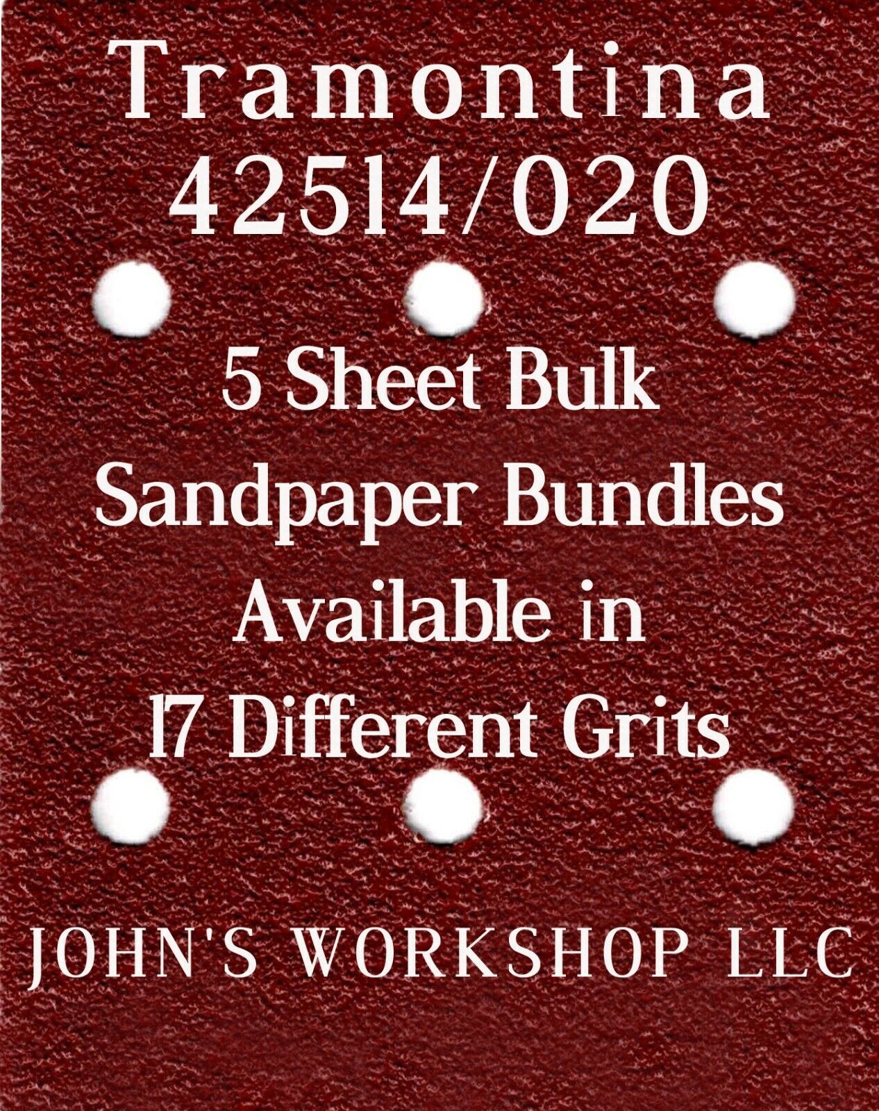 Note: Bulk Sandpaper Bundles arrive in bulk packaging without a John's Workshop header card attached and each bulk sandpaper bundle contains five sanding sheets