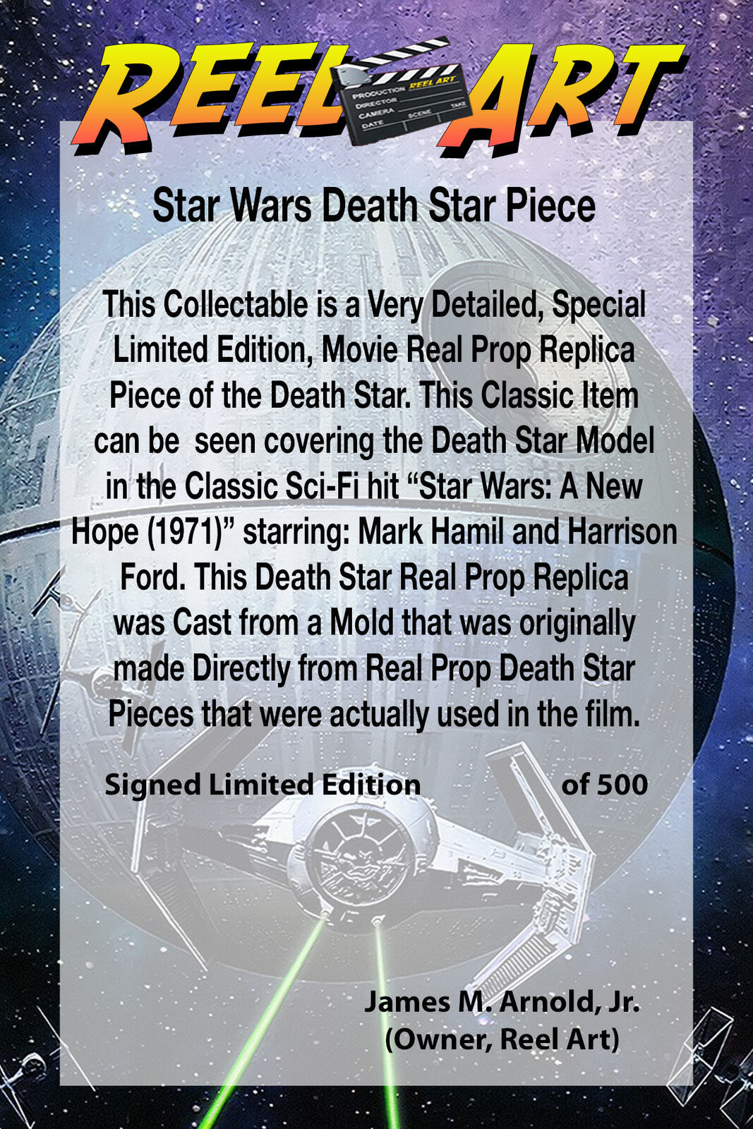 This Death Star Surface Piece (Type A) is part of our Exclusive, Signed, Numbered, Limited Edition, Star Wars Real Prop Replica Collection. This Classic Item can be seen covering the Death Star Model in the Classic Sci-Fi hit Star Wars: A New Hope (1977) starring: Mark Hamil and Harrison Ford. This Death Star Real Prop Replica was Cast from a Mold that was originally made Directly from Real Prop Death Star Pieces that were actually used in the film. Each item comes complete with a Double Sided, 4 x 6 inch, Full Color, Professionally Printed, Certification Card. This Documentation contains Poster Art and Explains in Detail about Death Star Surface Piece and how it was used in the film.