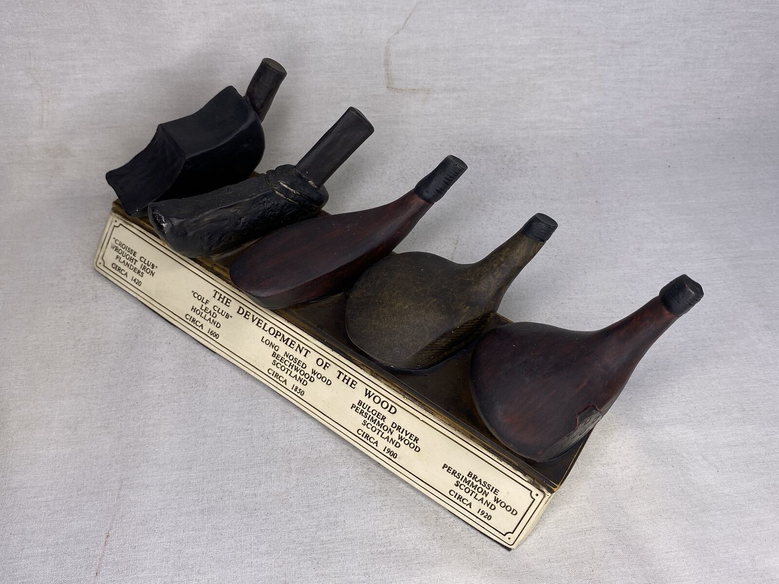 The Golf Wood Club Plaque Shows the Golf Wood as it traverses through Five Stages of its History of Development. On Display are Five of the Major Changes in the Golf Woods History from 1420 to 1920. It starts off with the Croisse Club Wrought Iron Flanders Circa 1420. Then moves to the Golf Club Lead Holland Circa 1600. Next the Long Nosed Wood Beechwood Scotland Circa 1850. Then Bulger Driver Persimmon Wood Scotland Circa 1900. Finally the Brassie Persimmon Wood Scotland Circa 1920. This is the one that led us to the Modern Wood Club we use today.