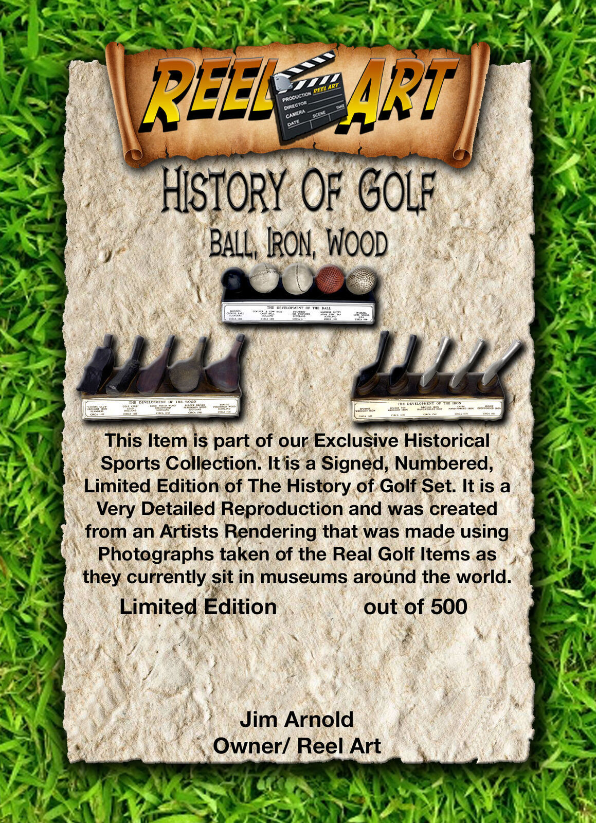 This Item is part of our Exclusive Historical Sports Collection. It is a Signed, Numbered, Limited Edition of The History of the Golf Wood Set. It is a Very Detailed Reproduction and was created from an Artists Rendering that was made using Photographs taken of the Real Wood Clubs as they currently sit in museums around the world. Each item comes complete with a Certification Card. This Card Explains the Full History of the Golf and the Woods that go with it.