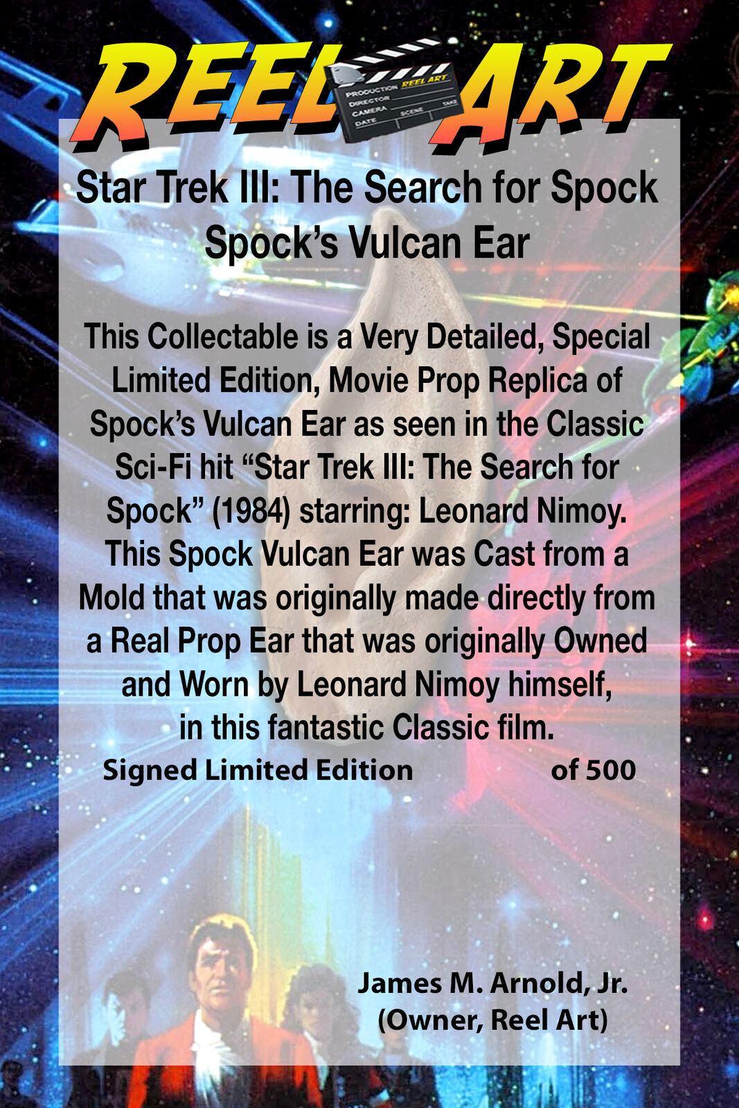 This is an Exclusive, Signed, Numbered, Limited Edition, Movie Prop Replica of Spock?s Vulcan Ear as seen in the Classic Sci-Fi hit Star Trek III: The Search for Spock (1984) starring: Leonard Nimoy. This Special Edition Prop Replica is Cast from a Mold Made Directly from a Real Prop Ear that was originally Owned and Worn by Leonard Nimoy himself, in this fantastic Classic film. Each Spock Vulcan Ear Comes Complete with a Double Sided, 4 x 6 inch, Full Color, Professionally Printed, Certification Card. This Documentation contains Poster Art and Explains in Detail about the Spock Ear and how it was used in the film.