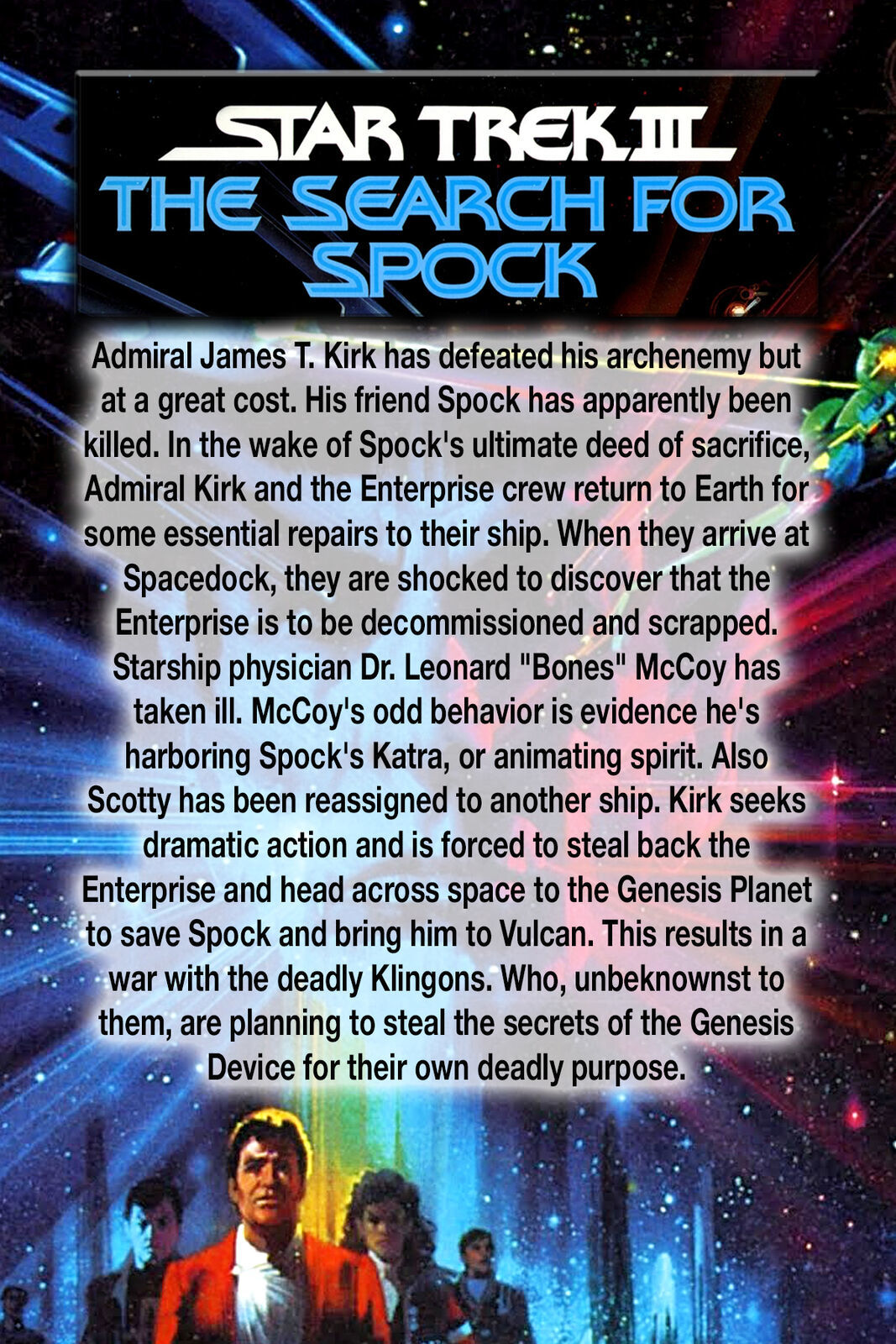 Admiral James T. Kirk has defeated his archenemy but at a great cost. His friend Spock has apparently been killed. In the wake of Spock's ultimate deed of sacrifice, Admiral Kirk and the Enterprise crew return to Earth for some essential repairs to their ship. When they arrive at Space Dock, they are shocked to discover that the Enterprise is to be decommissioned and scrapped. Starship physician Dr. Leonard "Bones" McCoy has taken ill. McCoy's odd behavior is evidence he's harboring Spock's Katra, or animating spirit. Also Scotty has been reassigned to another ship. Kirk seeks dramatic action and is forced to steal back the Enterprise and head across space to the Genesis Planet to save Spock and bring him to Vulcan. This results in a war with the deadly Klingons. Who, unbeknownst to them, are planning to steal the secrets of the Genesis Device for their own deadly purpose.