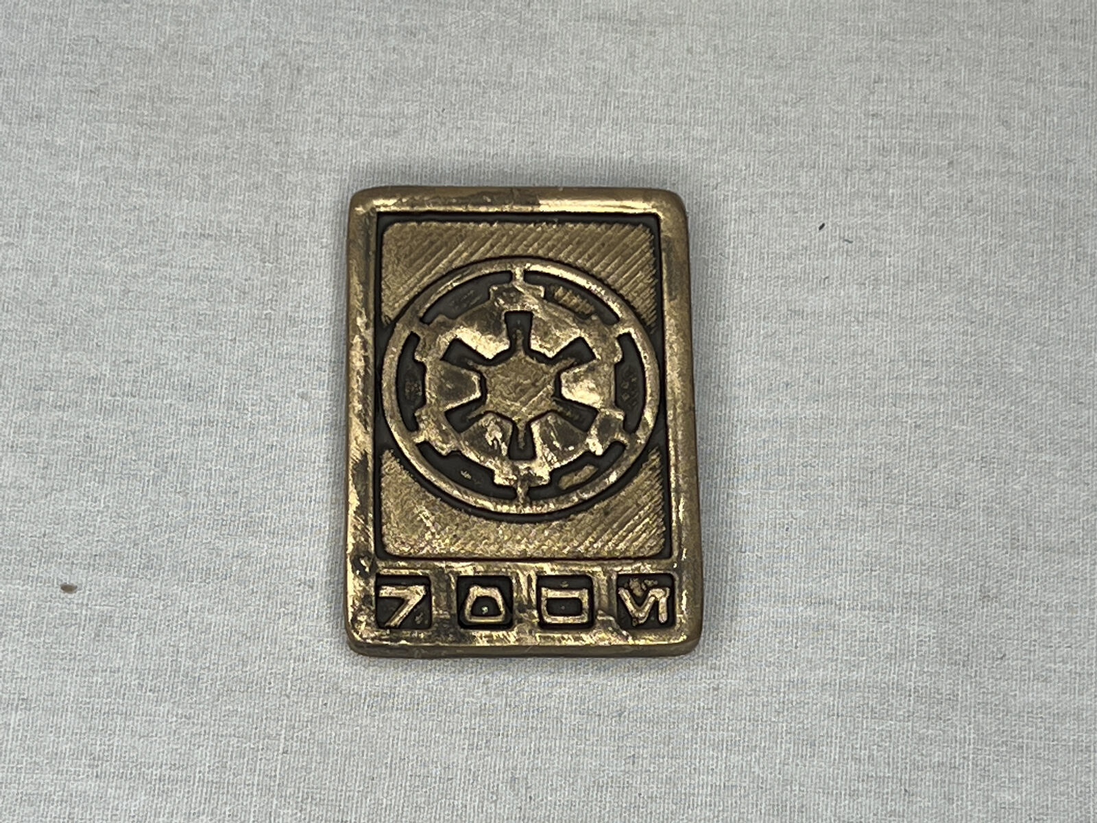 This Star Wars Galactic Gold Credit Chip is Very Durable and made out of Solid Metal. It is Gold in Color, Artistically Aged and measures; 1.25 inches wide by 1.75 inches long by .25 inches thick.