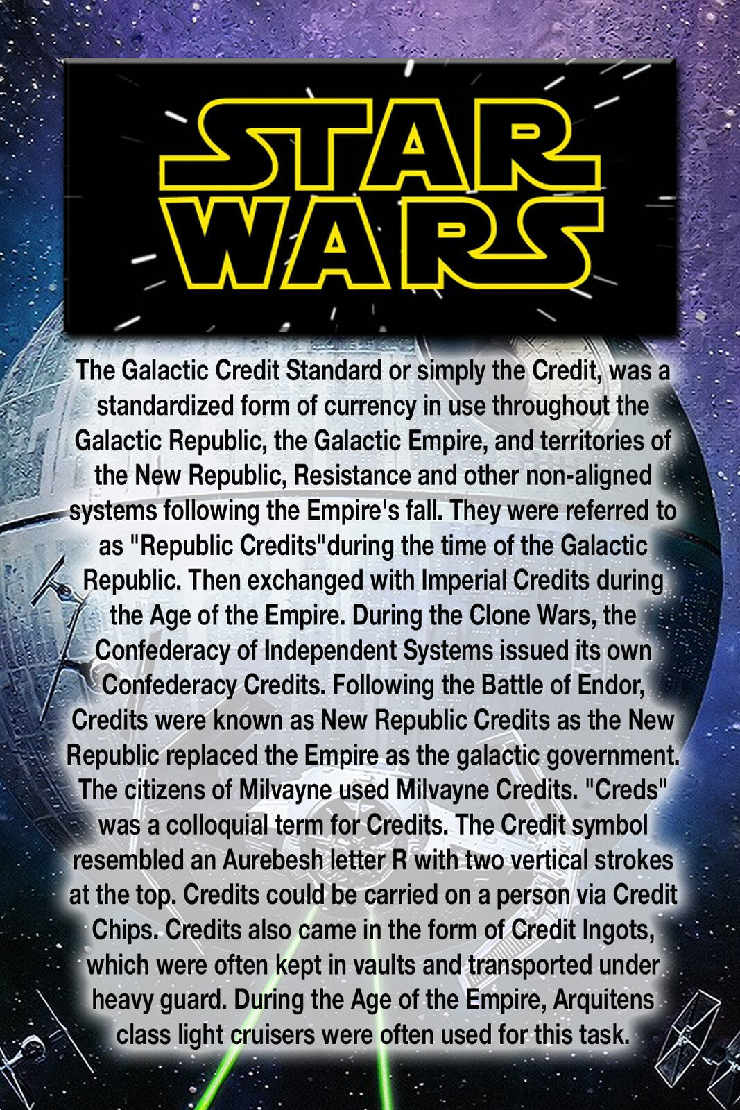 The Galactic Credit Standard or simply the Credit, was a standardized form of currency in use throughout the Galactic Empire and territories of the New Republic, Resistance and other non-aligned systems following the Empire's fall. Credits could be carried on a person via Credit Chips. Credits also came in the form of Credit Ingots, which were often kept in vaults and transported under heavy guard.