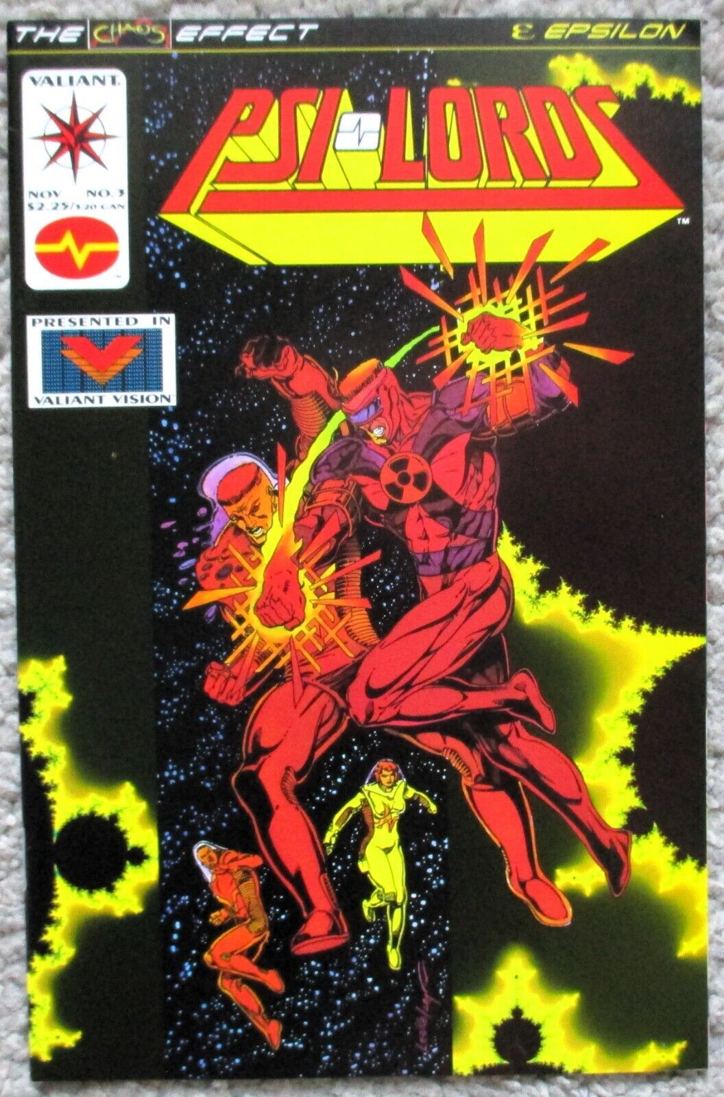 #3 (November 1994) THE CHAOS EFFECT - EPSILON: Part 2 (of 4; 15 of 18). Presented in Valiant Vision. In the year 4020...The Psi-Lords find their long-ranged communications scrambled, and scan to find the root of the disturbance. Imagine their surprise when Solar the Destroyer appears on the bridge of their station! The Destroyer is on his way to Earth and nothing is going to stop him -- not even the Psi-Lords! "Destroyers" is written by Tony Bedard, with art by Mike Leeke and Dick Giordano. Cover by Mike Leeke and Bob Layton. Cover price $2.25.