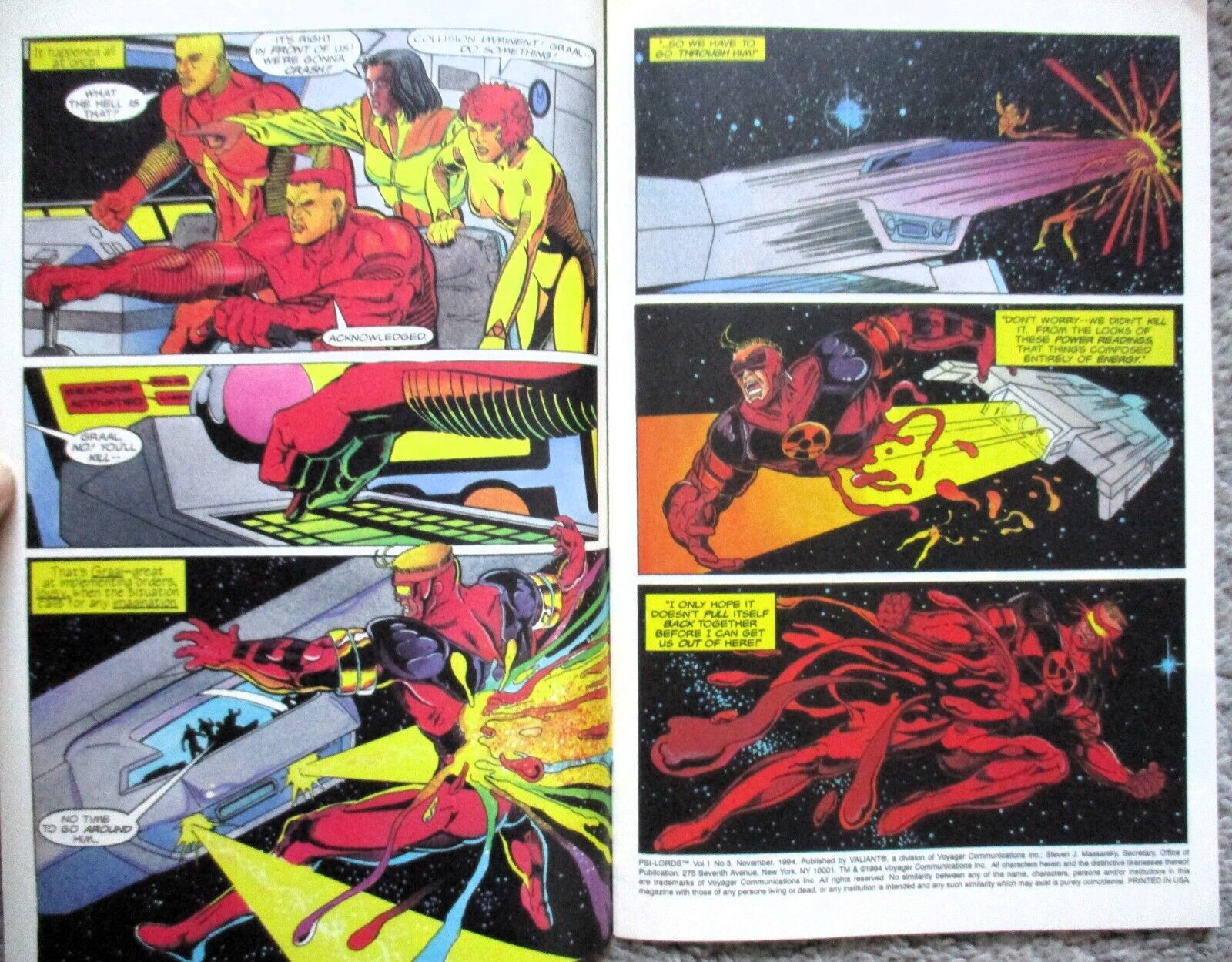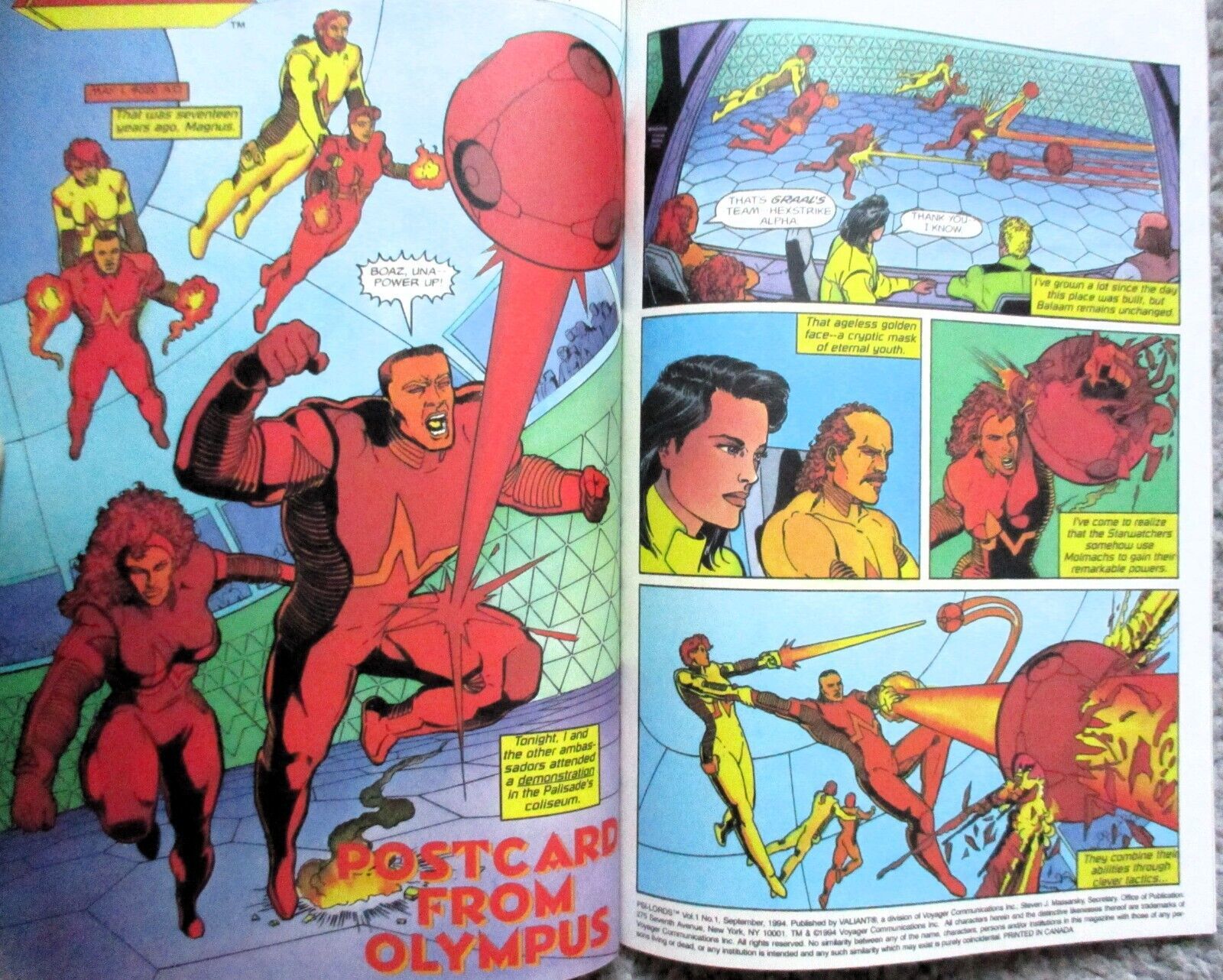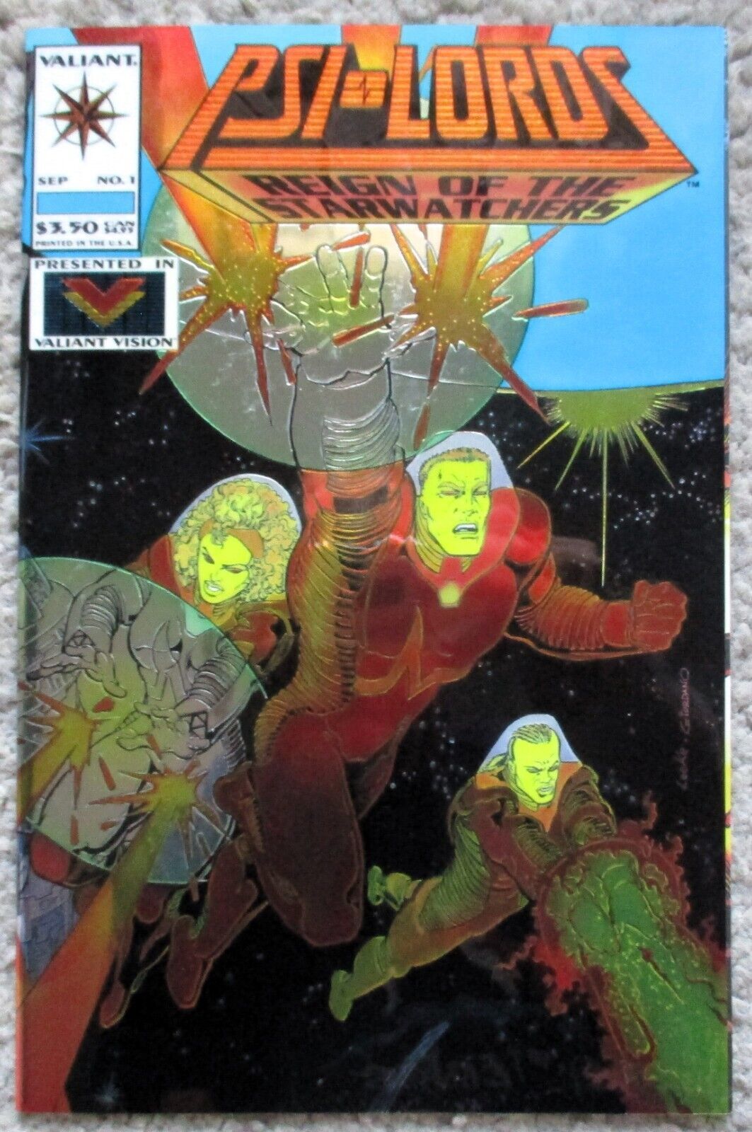 #1 (September 1994) Chromium cover - Title Box is White - Has a cover price of $3.50. In the year 4020...The mysterious Psi-Lords have arrived from deep space, offering their incredible powers to safeguard Earth's solar system. The trouble is, no one trusts them to do the job...that is, until the citizens of Saturn's moon, Titan, fall victim to the return of the Spider-Aliens! This issue, along with Magnus Robot Fighter (1991 Valiant) #39 and Rai (1992) #24, begins the story of Earth in the year 4020 -- 17 years after the end of the war against the Malevs! This debut issue is completely rendered in Valiant Vision (3-D). "Postcard from Olympus" is written by Tony Bedard, with art and wraparound chromium cover by Mike Leeke and Dick Giordano. Cover price $3.50.