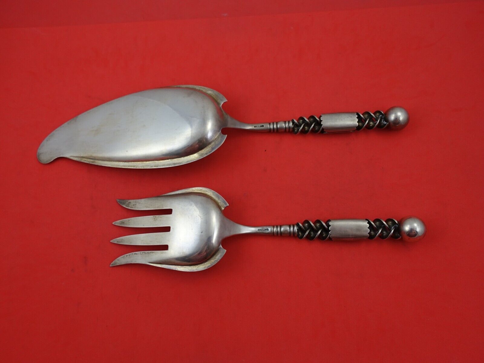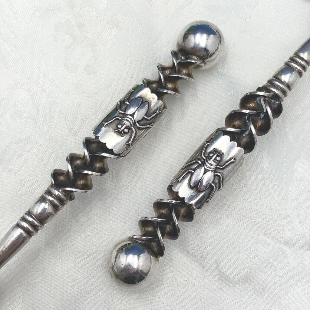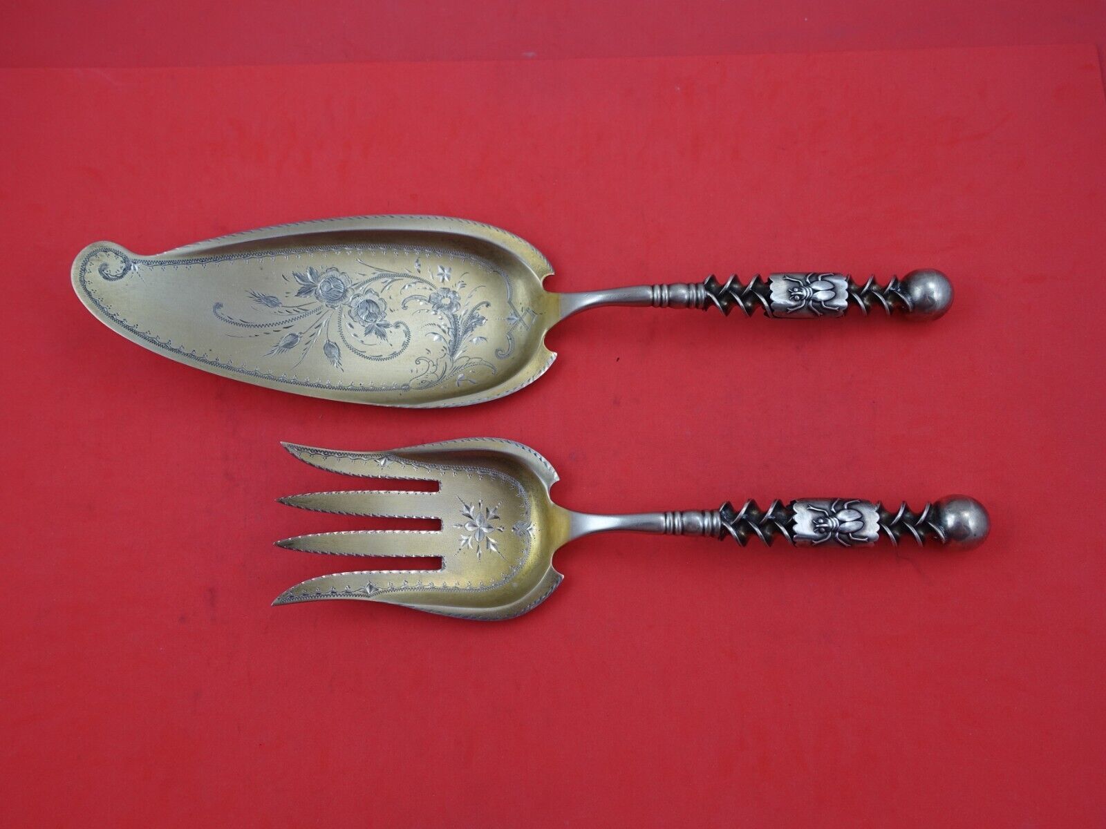 Aesthetic Bug pattern sterling silver abstract Fish Serving Set 2-Piece Gold Washed and Bright-Cut. (The pieces are unmarked, but presumably made by Shiebler.) The handles have a ball end and have an unusual double twist which gives the illusion of beautiful braiding. Halfway down the twist is an applied scalloped ribbon with an applied bug. The serving areas are gold washed with a stipple finish and are hand engraved with highly detailed borders and center floral designs. This set includes: