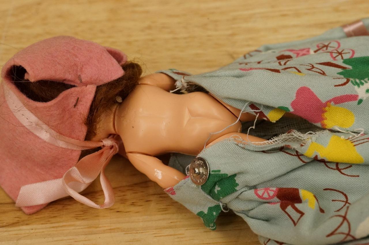 Vintage Estate Toy Plastic Storybook Costume Doll Ice Cream In the Park Dress. Strung jointed. 5" tall. Original clothing. hard plastic. All original. Dates to the 1940's.
