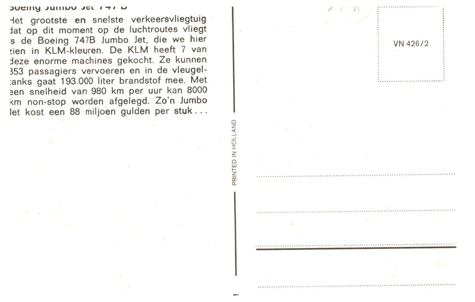 KLM Boeing Jumbo Jet 747 B Airplane Postcard