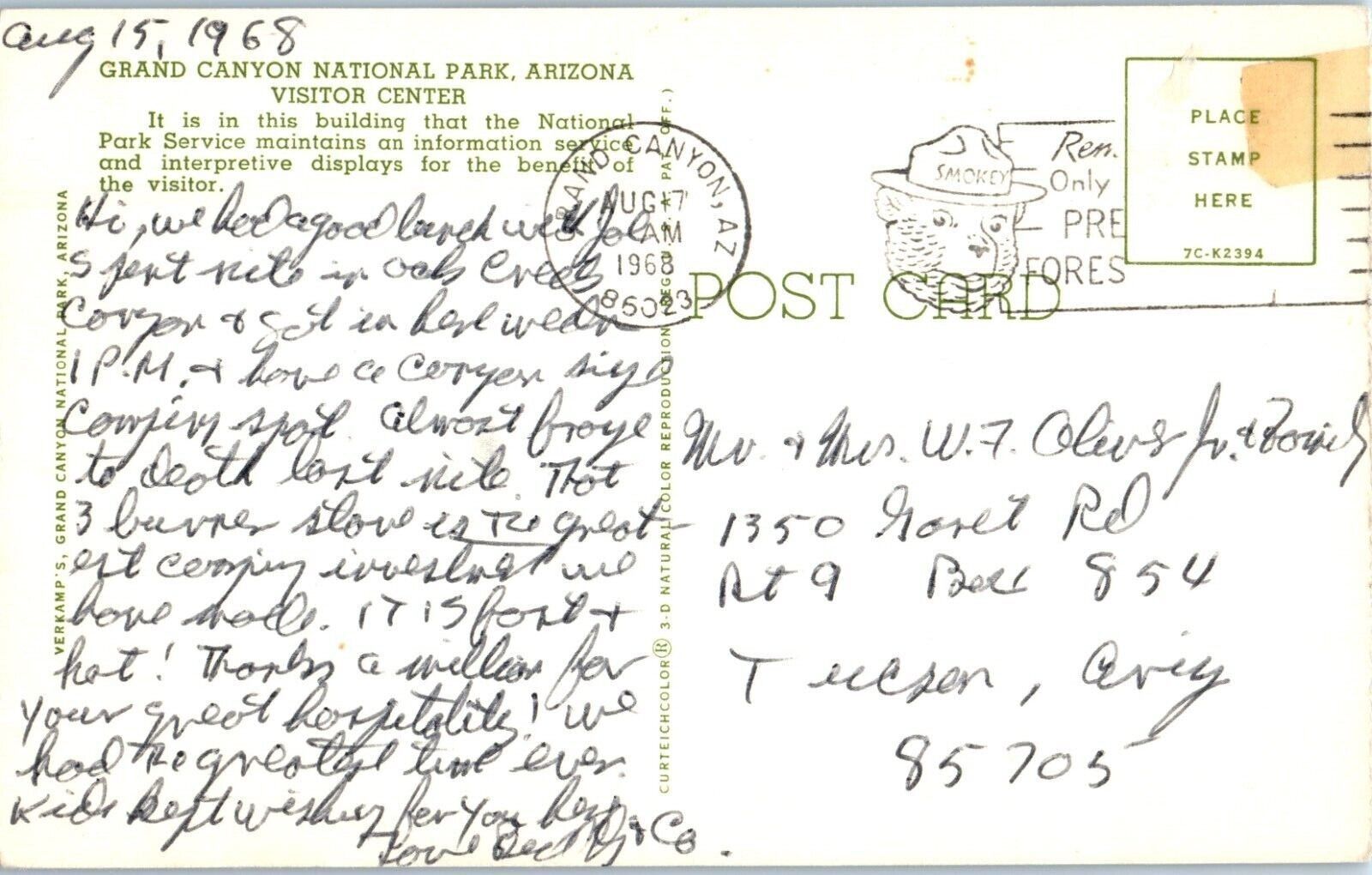 Grand Canyon National Park Visitor Center Arizona Postcard Posted 1968