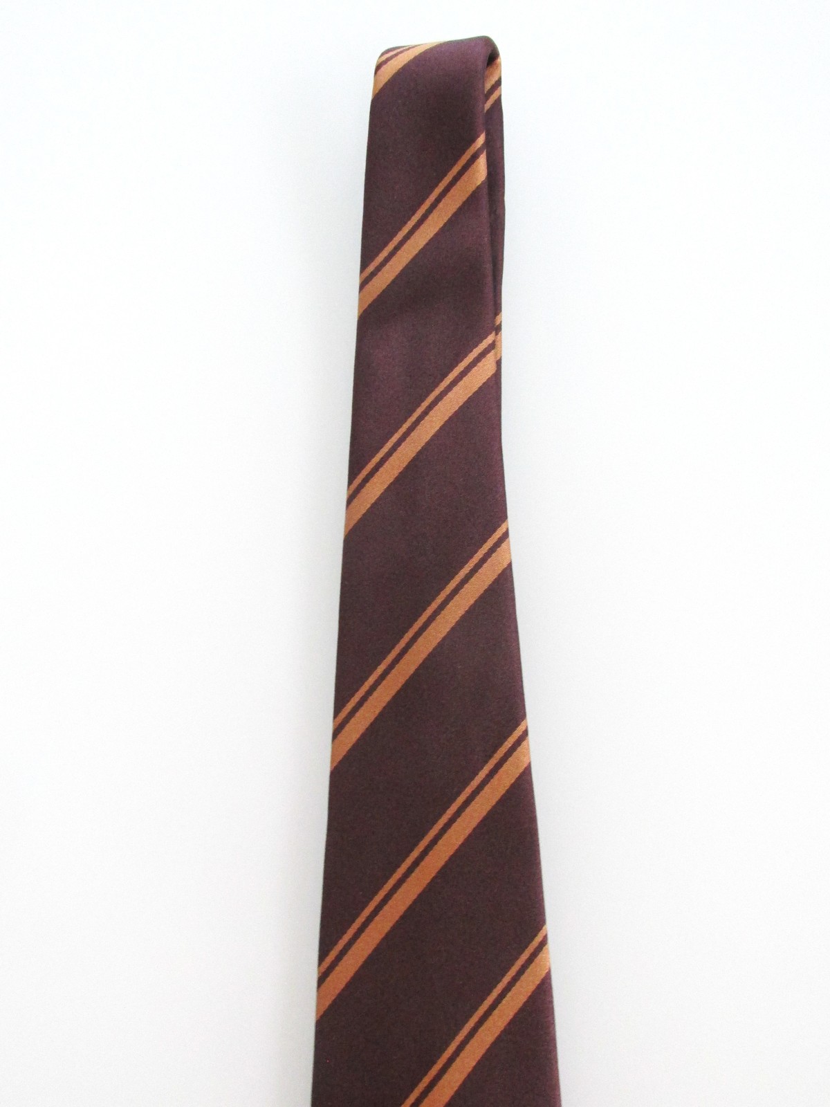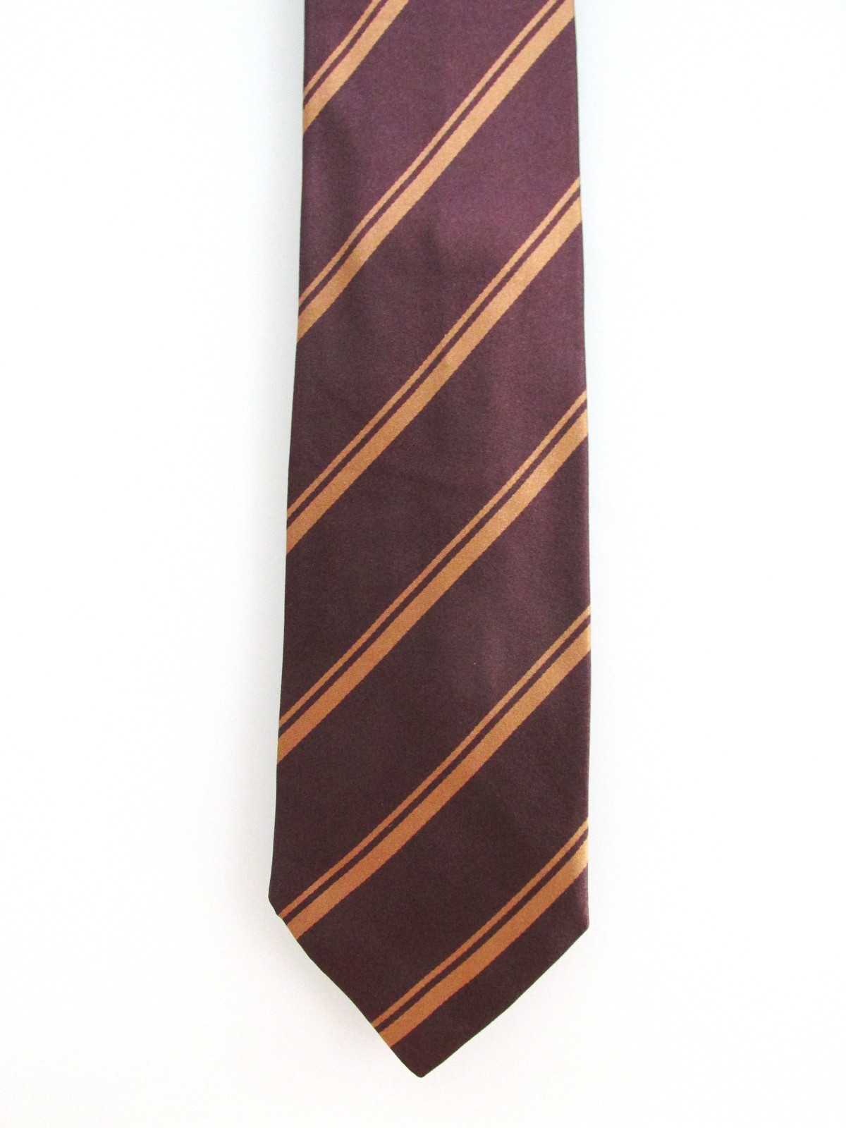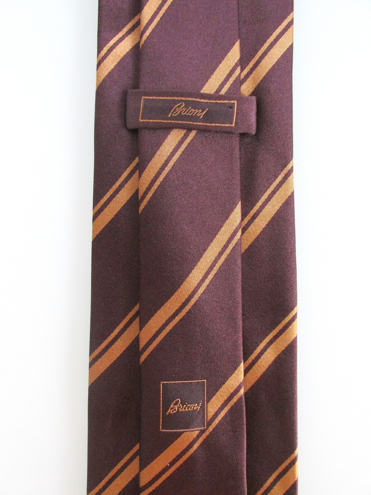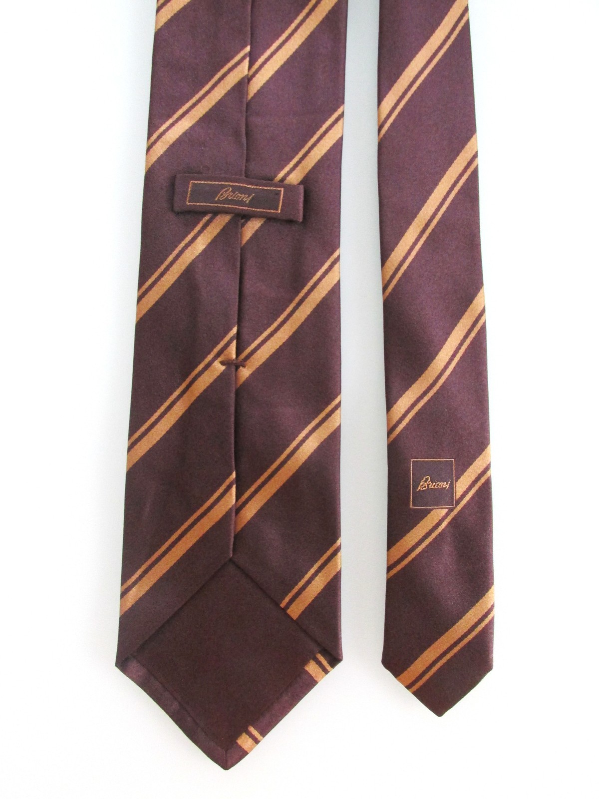Description: Up for sale is a men's designer silk tie by Brioni. The tie is handmade in Italy of 100% silk. The tie has a tan/gold striped pattern on a dark plum background. Dimensions are approximately 58" long x 3 5/8" wide. This tie is in excellent condition.