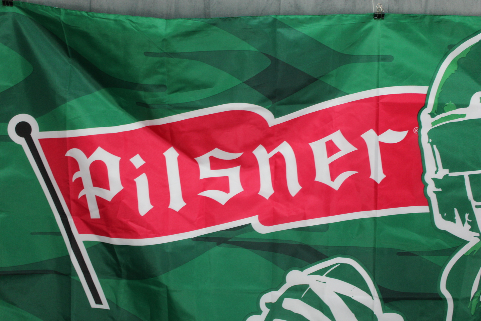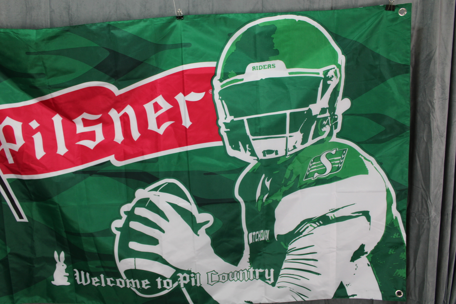 Up for sale is a Saskatchewan Roughriders flag by Pilsner Beer. It is a double-sided flag with a green base colour. One side of the flag has the Pilsner flag over the shoulder of a quarterback throwing a football graphic. The other side of the flag has the Saskatchewan Roughrider logo in the middle with bars on either side of the flag made up of Pilsner rabbits. What a great addition to any collection.