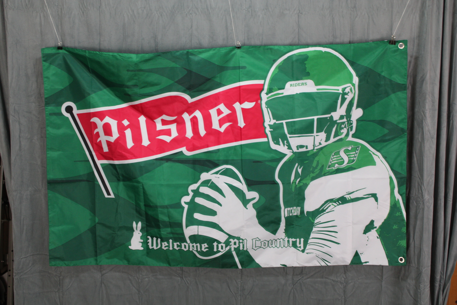 Saskatchewan Roughrider Flag - Quarterback Pilsner Promo - Double Sided Flag
