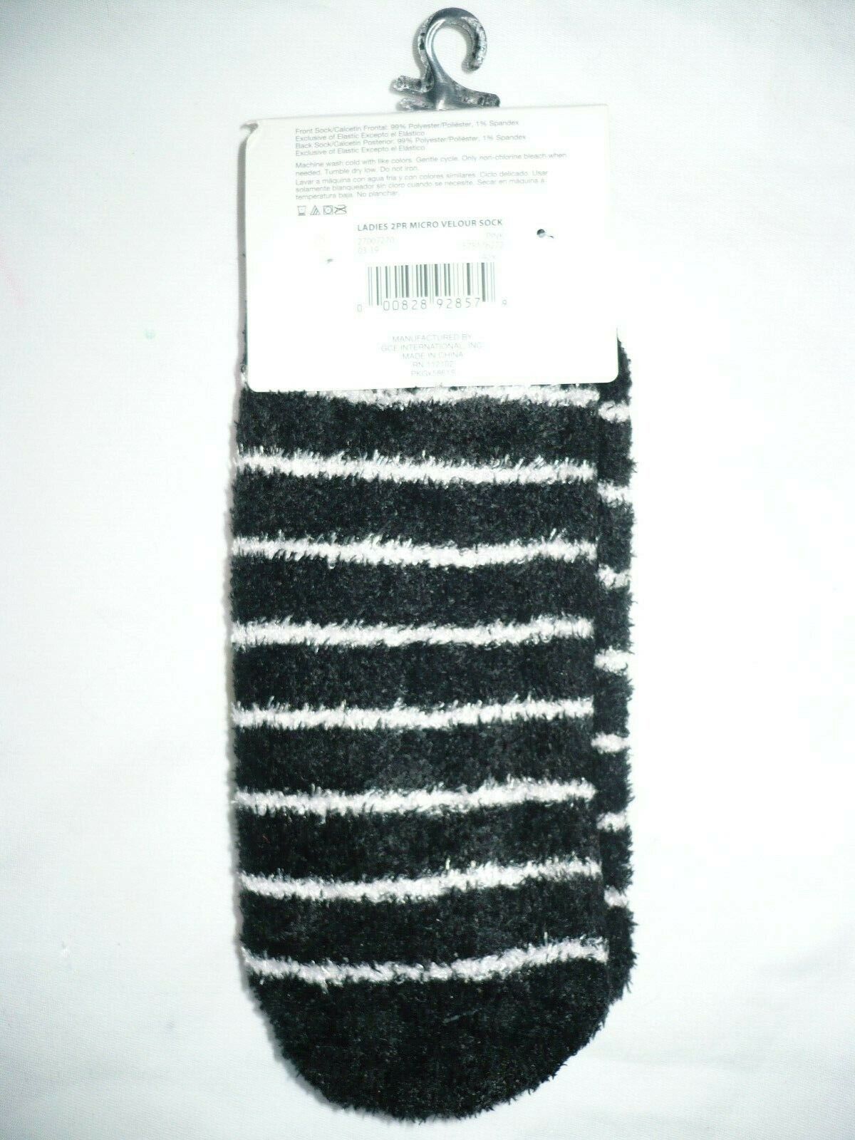 Micro Velour Women's Low-Cut Socks. Shoe size 4-10. 2 Pair. New. 99% polyester, 1% spandex. Machine wash, tumble dry low. These are so soft, once you have them on, you wont want to take them off. They have little grippers on the bottom so you don't slip down and fall.