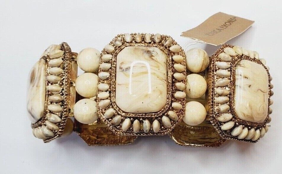 Erica Lyons Stretch Bracelet Ivory Marble Look Gold Tone Gorgeous! New #22
