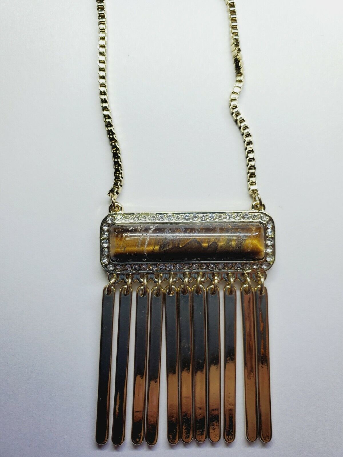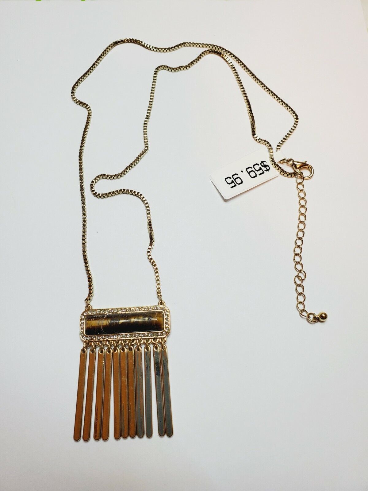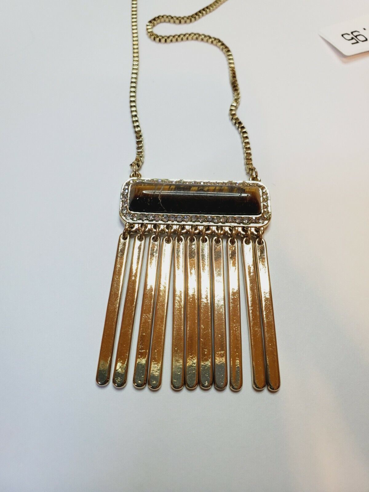 Ballet Jewelry Company. Women's gold tone metal necklace with fringe pendant. Rectangle stone with rhinestones around it. New. Necklace is 25 inches with a 3 inch extender. Lobster clasp closure. Beautiful piece!