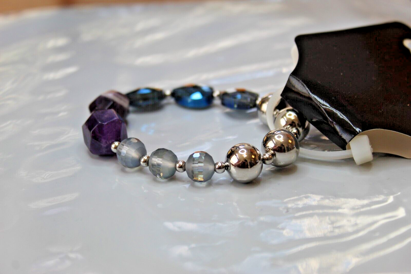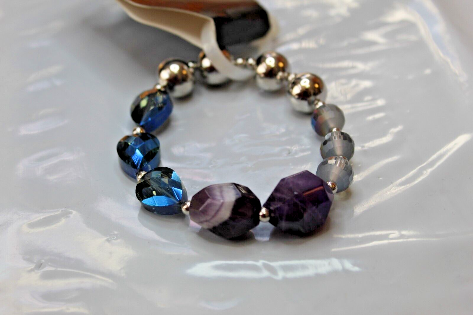 Unbranded. Blue Purple gemstones With silver clear beaded stretch bracelet. New. Bracelet is about 7 1/2 inches long.