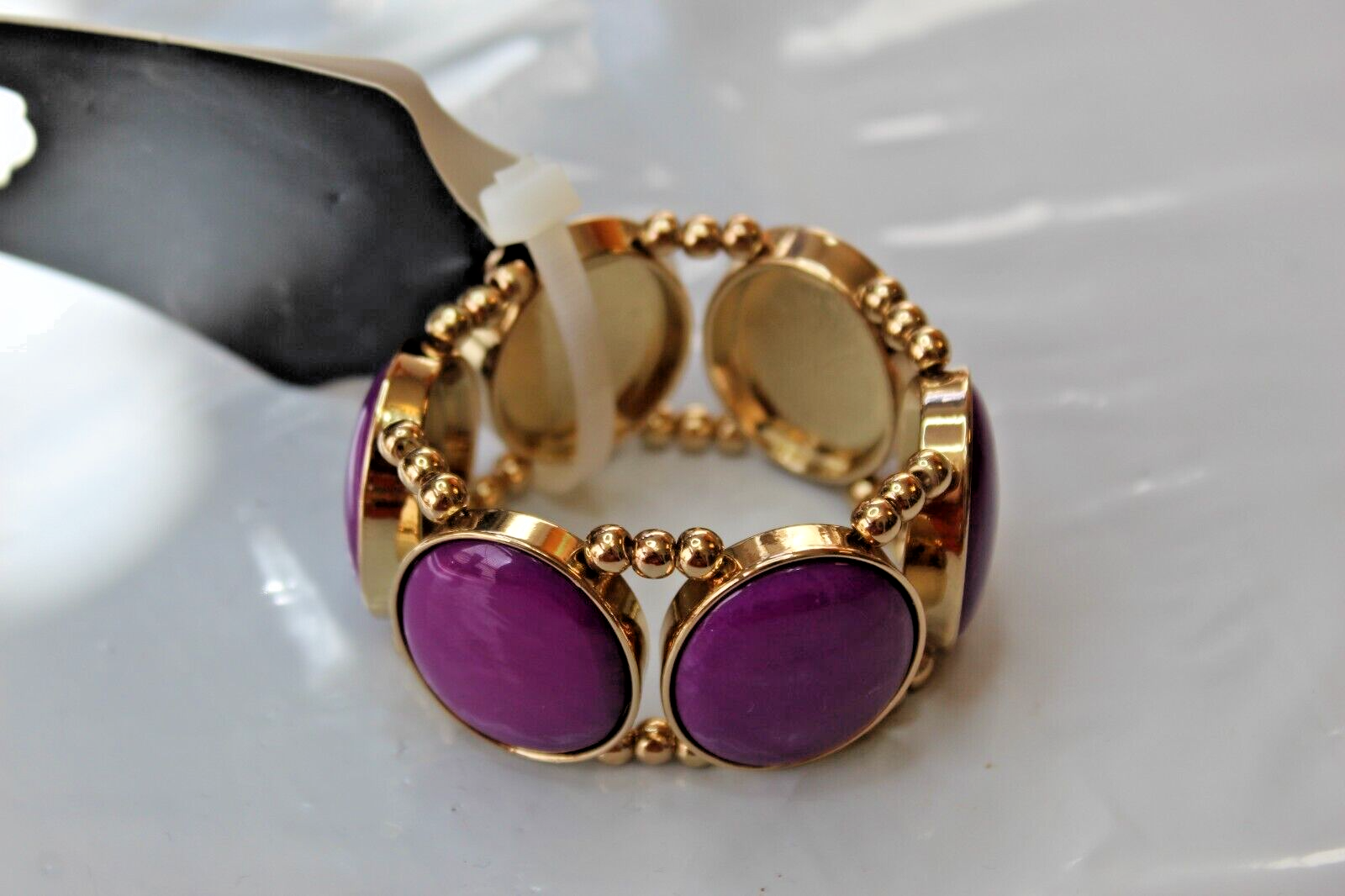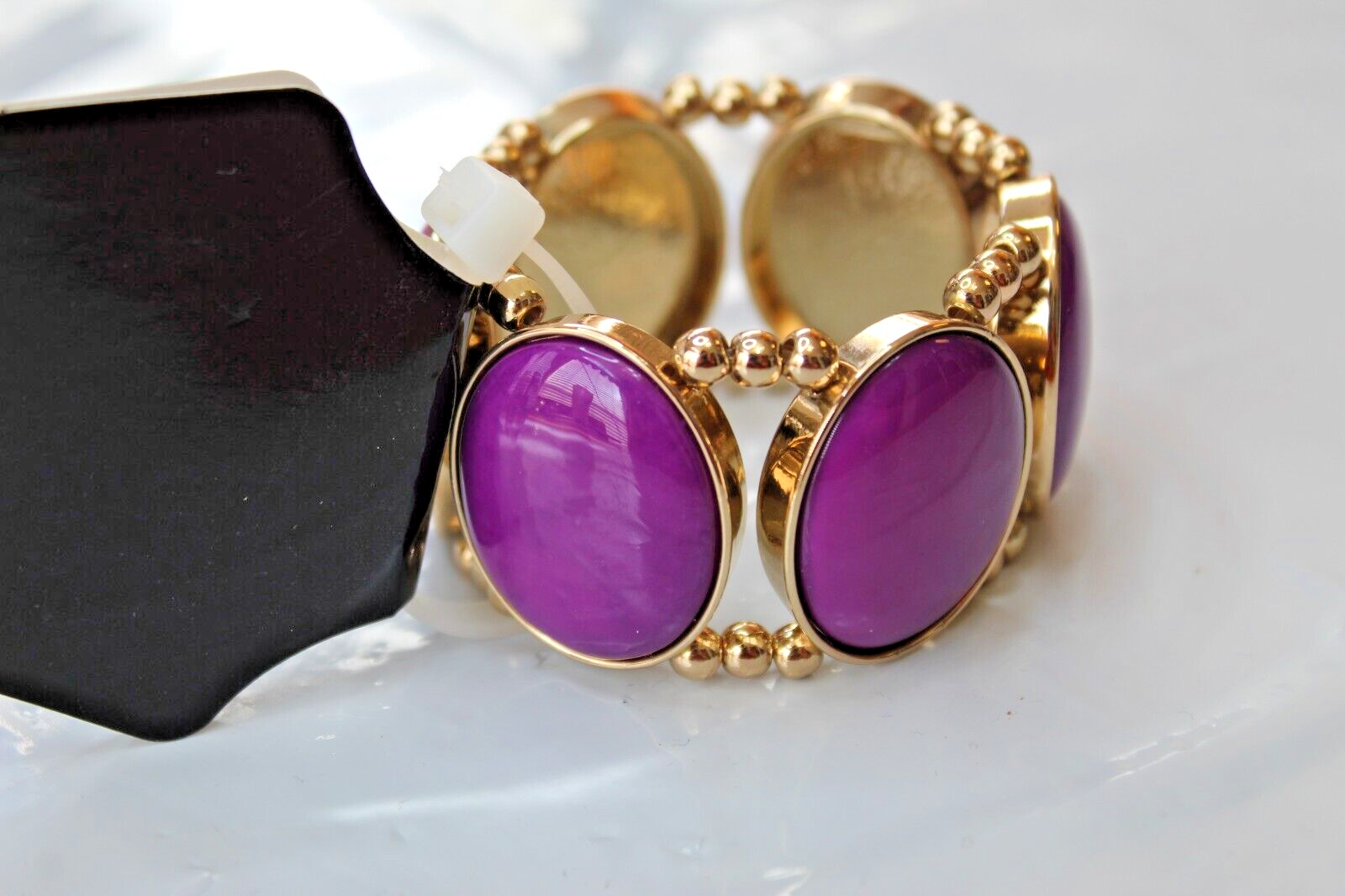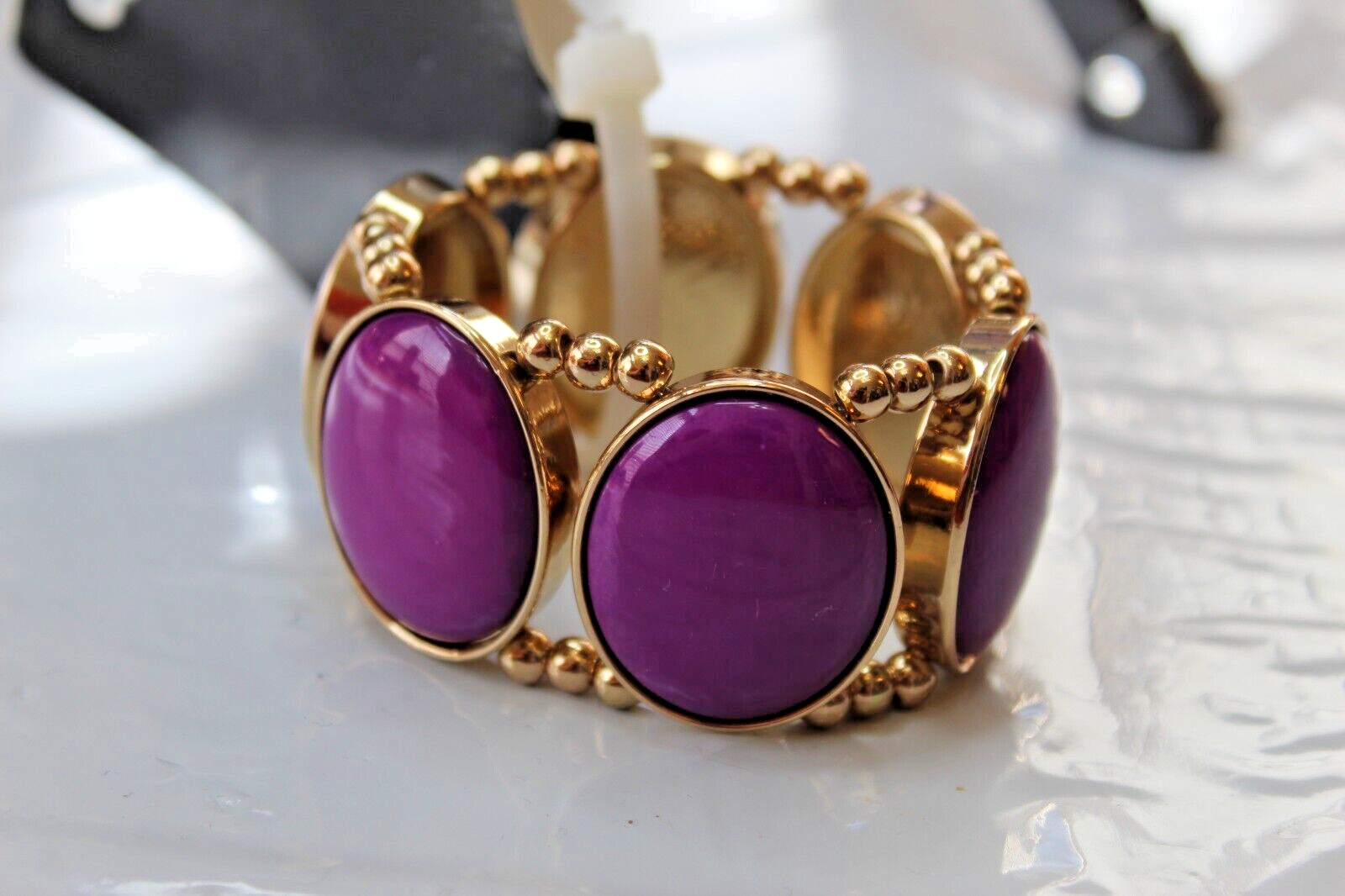 Gold Tone With Purple Oval Stones & Beads Stretch Bracelet NEW
