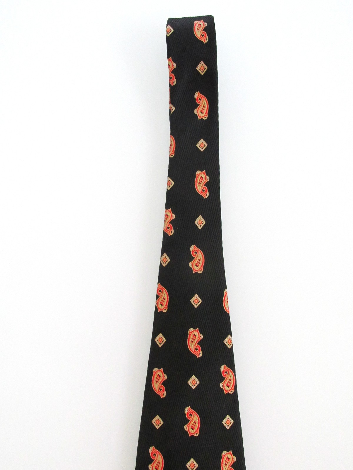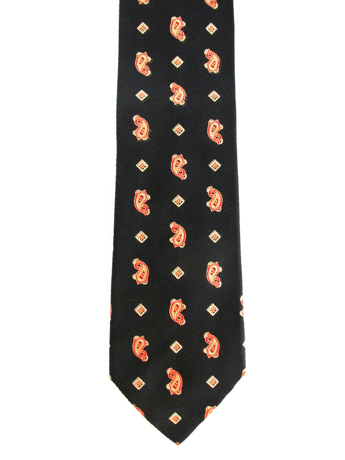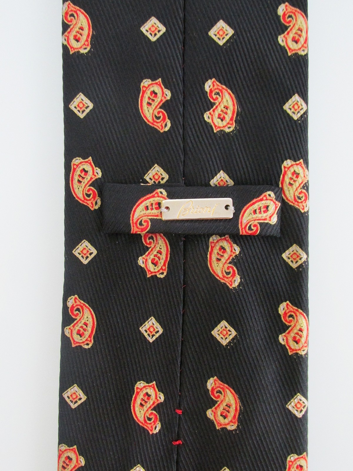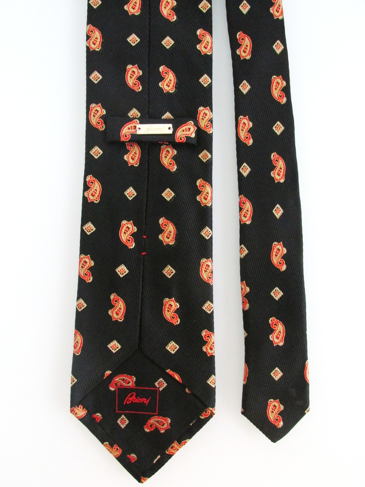 Description: Up for sale is a men's designer silk tie by Brioni. The tie is handmade in Italy of 100% silk. The tie has a multicolored paisley pattern in red, silver gold on a black background. It also has the Brioni gold bar on the back and is fully lined. Dimensions are approximately 60" long x 3.75" wide. This tie is in excellent condition.
