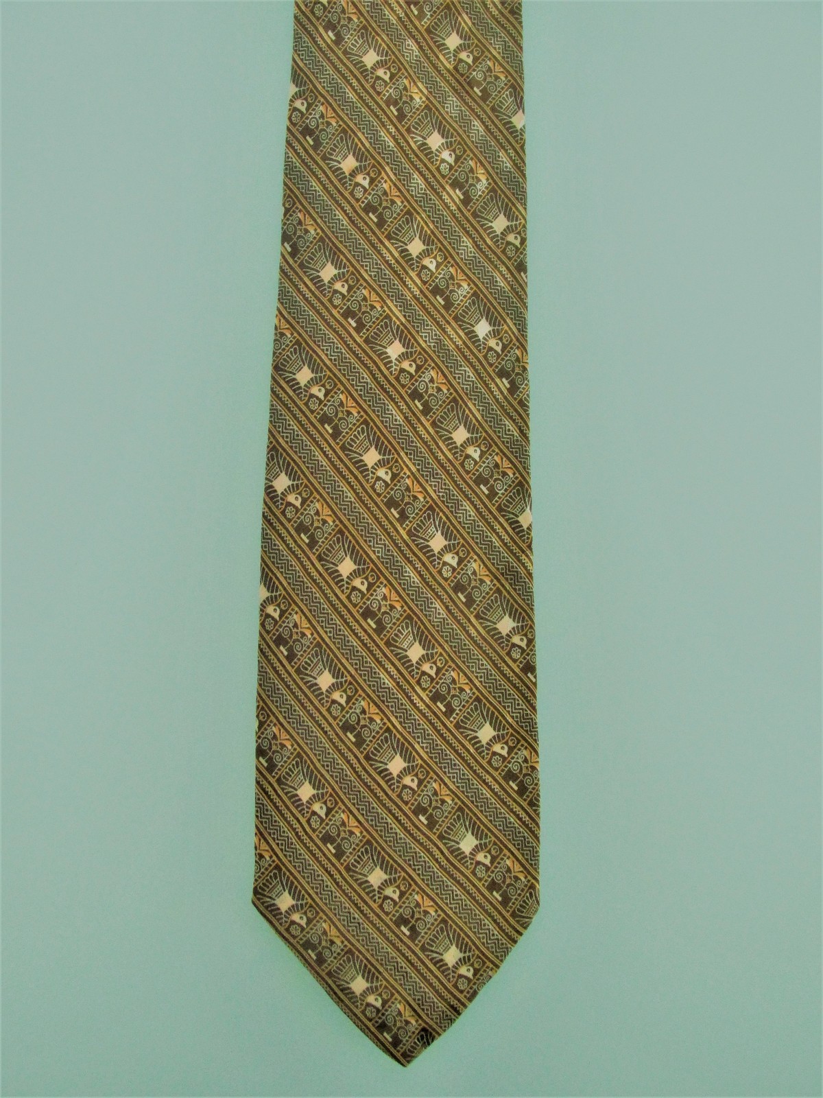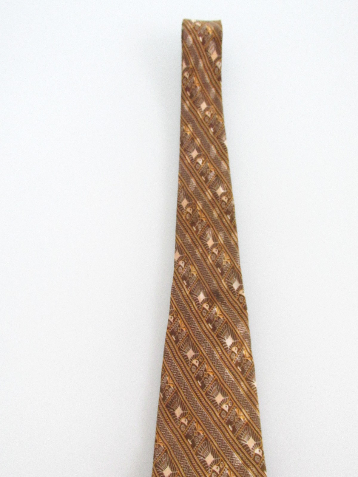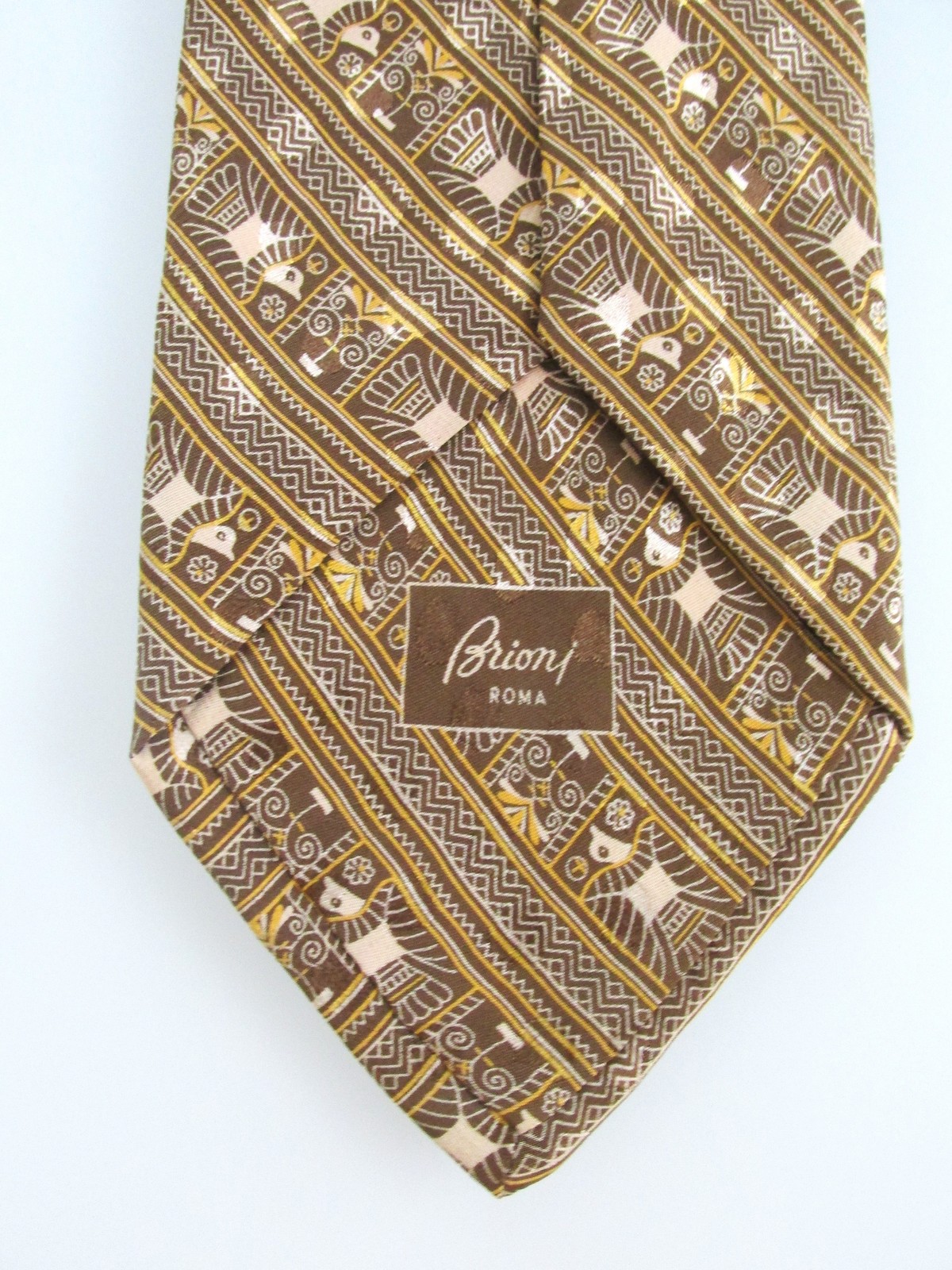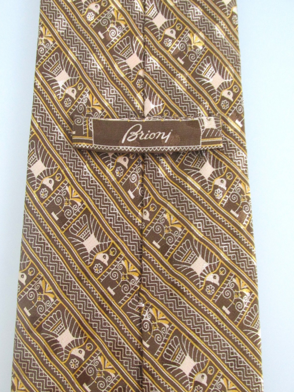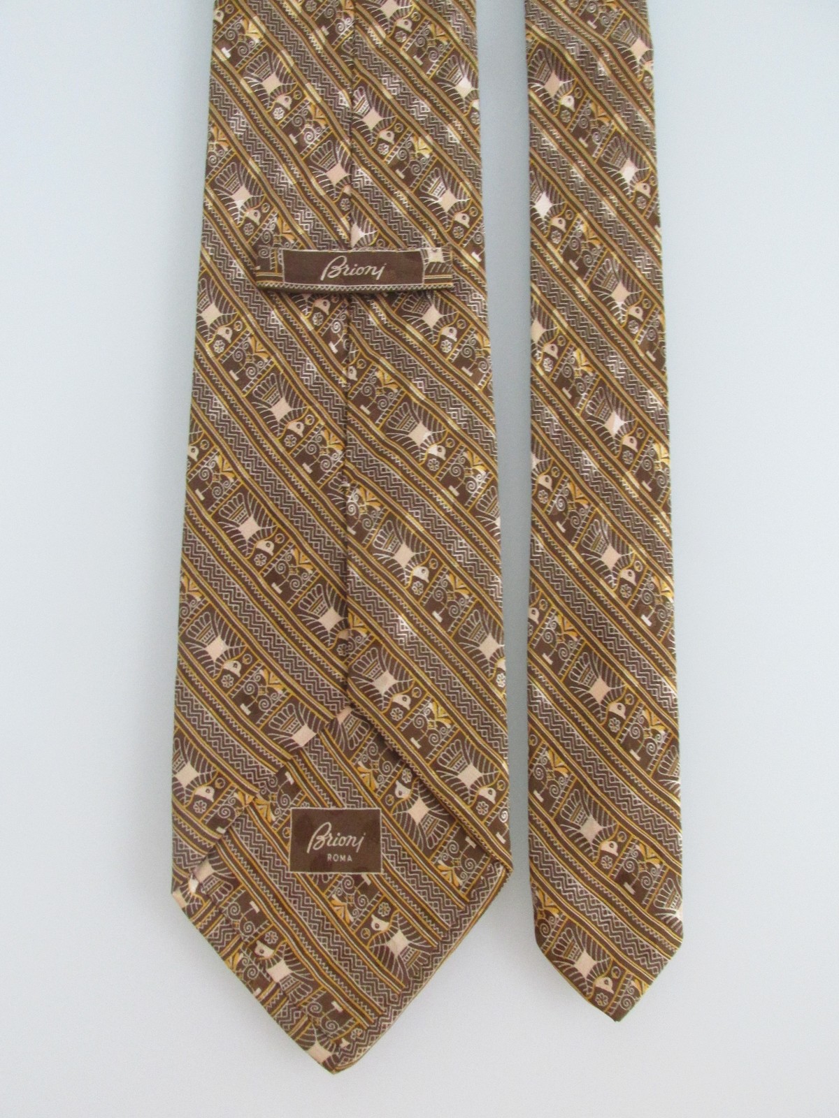 Description: Up for sale is a men's designer silk tie by Brioni. The tie is handmade in Italy of 100% silk and fully lined. The tie has a multicolored pattern in gold, brown ivory. The print number is A020130. Dimensions are approximately 58" long x 3.75" wide. This tie is in excellent condition.