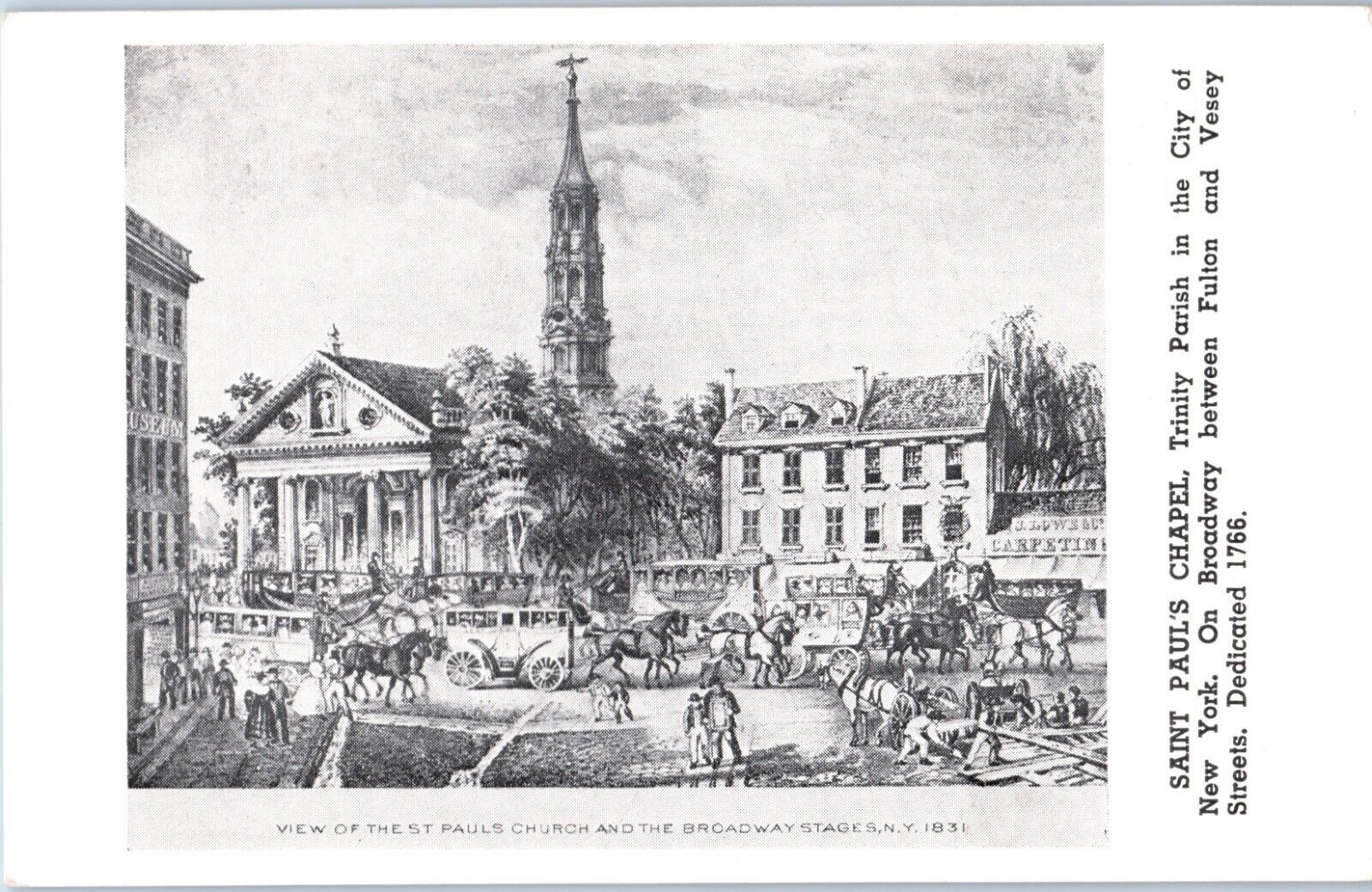 St. Paul's Church and The Broadway Stages New York City Postcard 1831 Reprint