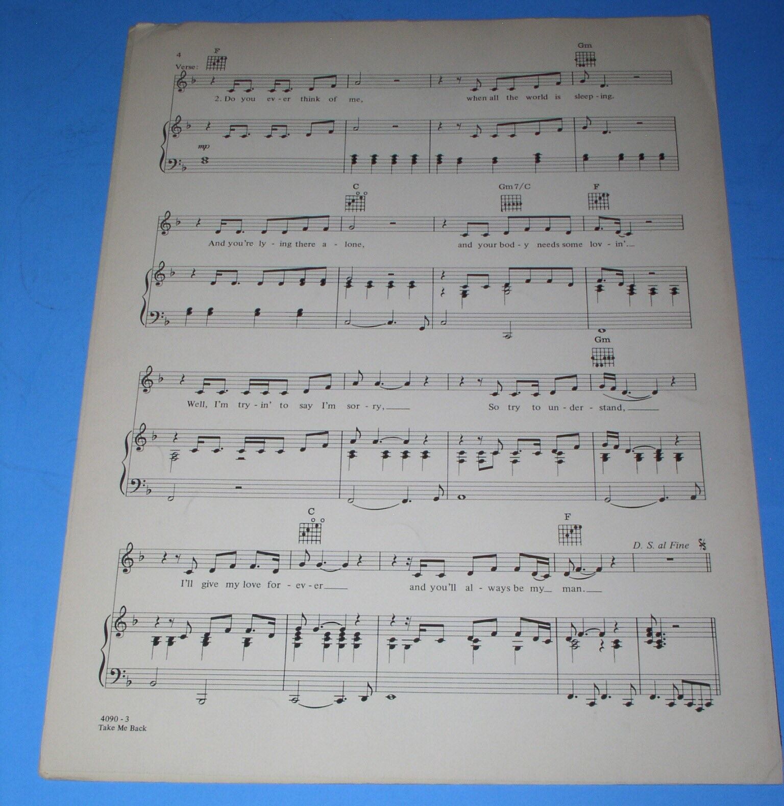 This is the original, vintage sheet music for the song, "Take Me Back". Dated 1978 by Bill Black Music, Inc.