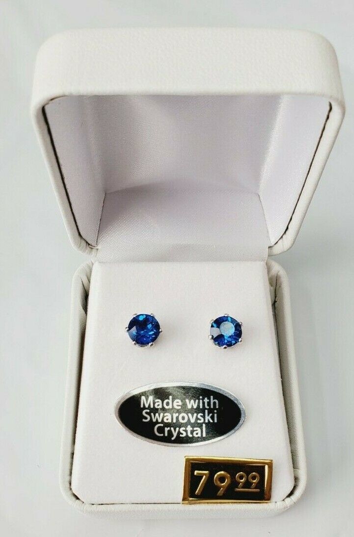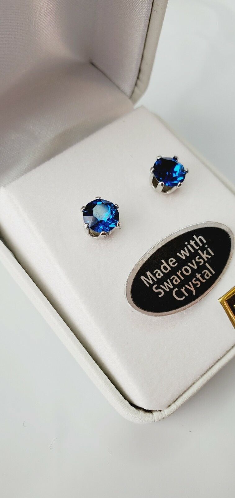Gorgeous Crystals By Swarovski Sterling Silver overlay earrings. New. London Blue. 2 Carat total weight earrings. 6mm each. ( A little over 1/4 an inch.) 6 prong. Stud back. Comes in a white leatherette gift box.