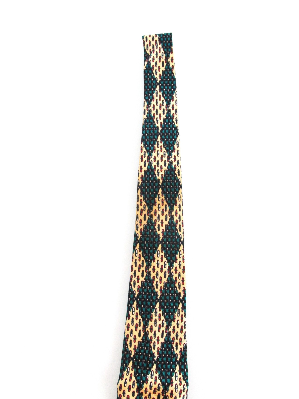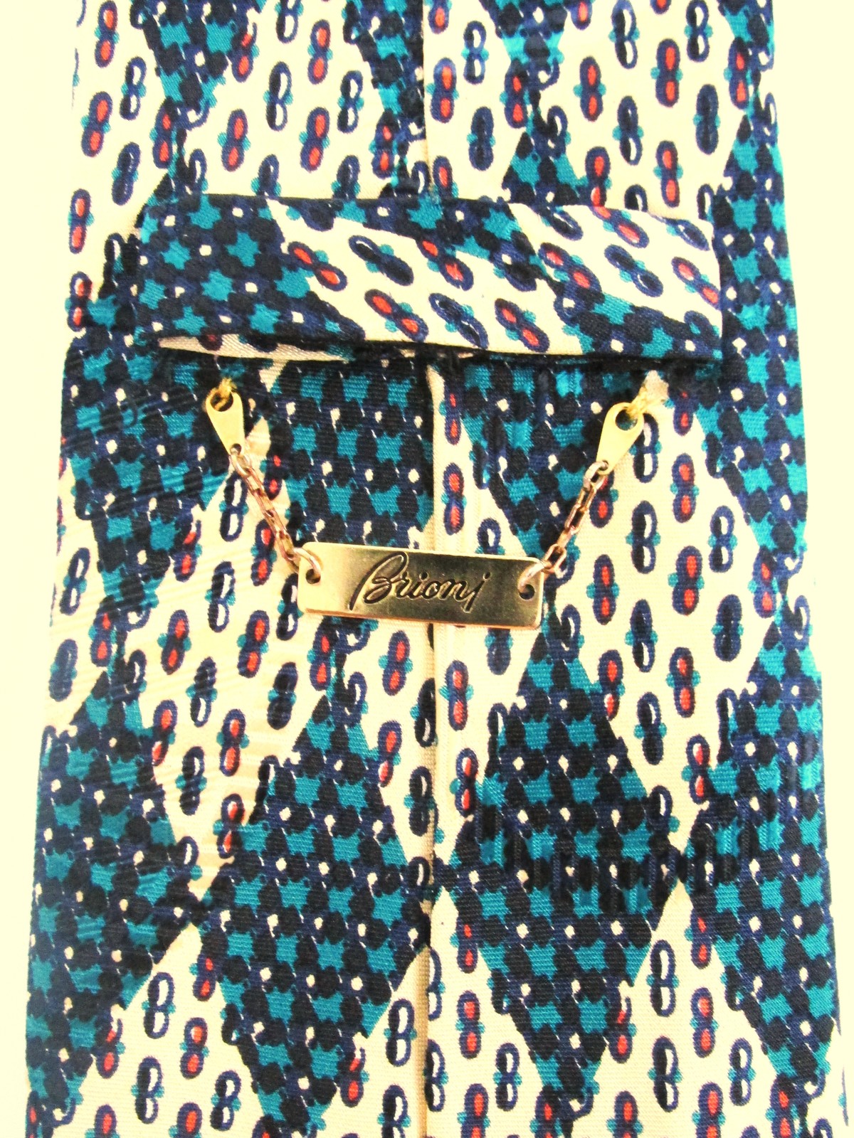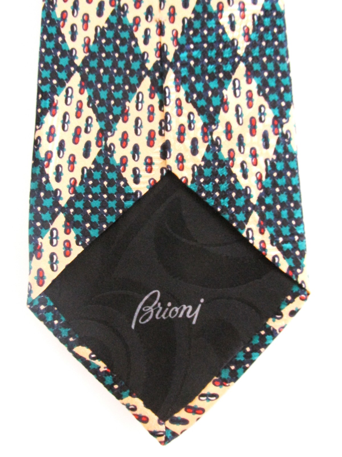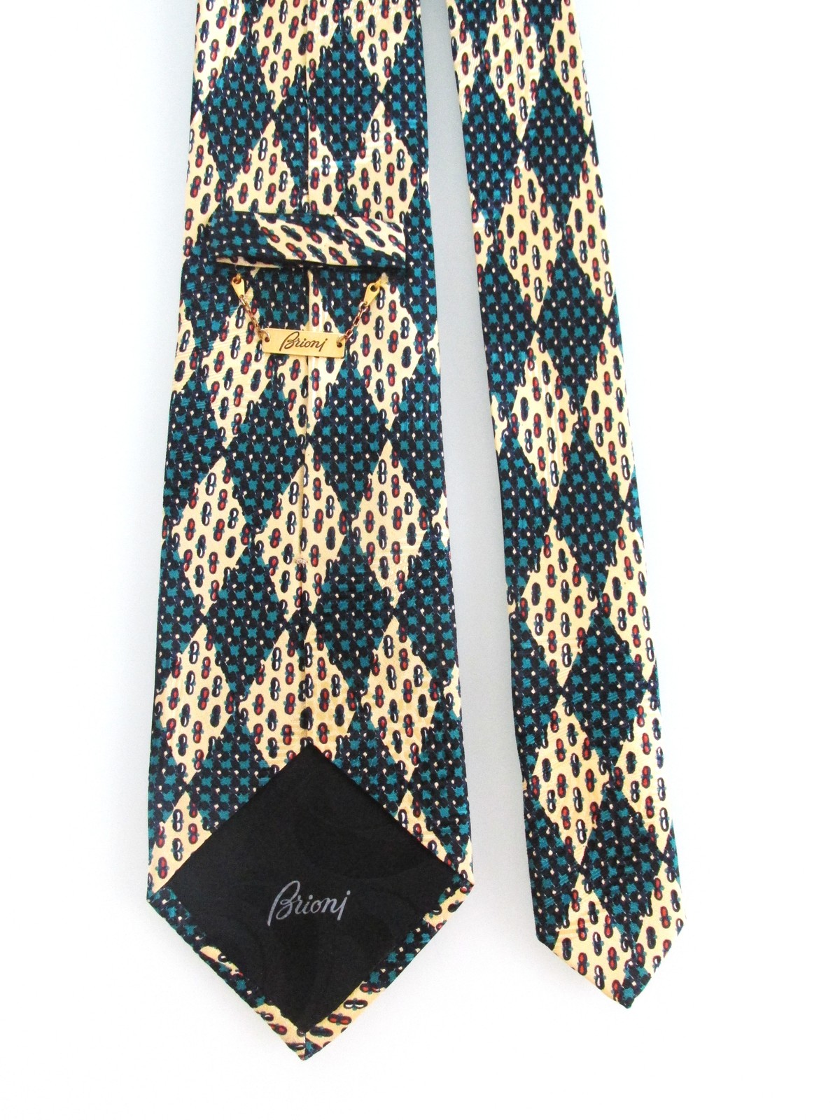 Description: Up for sale is a vintage designer men's silk tie by Brioni. The tie is handmade in Italy of 100% silk. The tie has a multicolored design in green, yellow, black white. This tie has the Brioni gold chain tie keeper on the back. The dimensions are 56" long x 3.50" wide. This tie is in excellent condition.