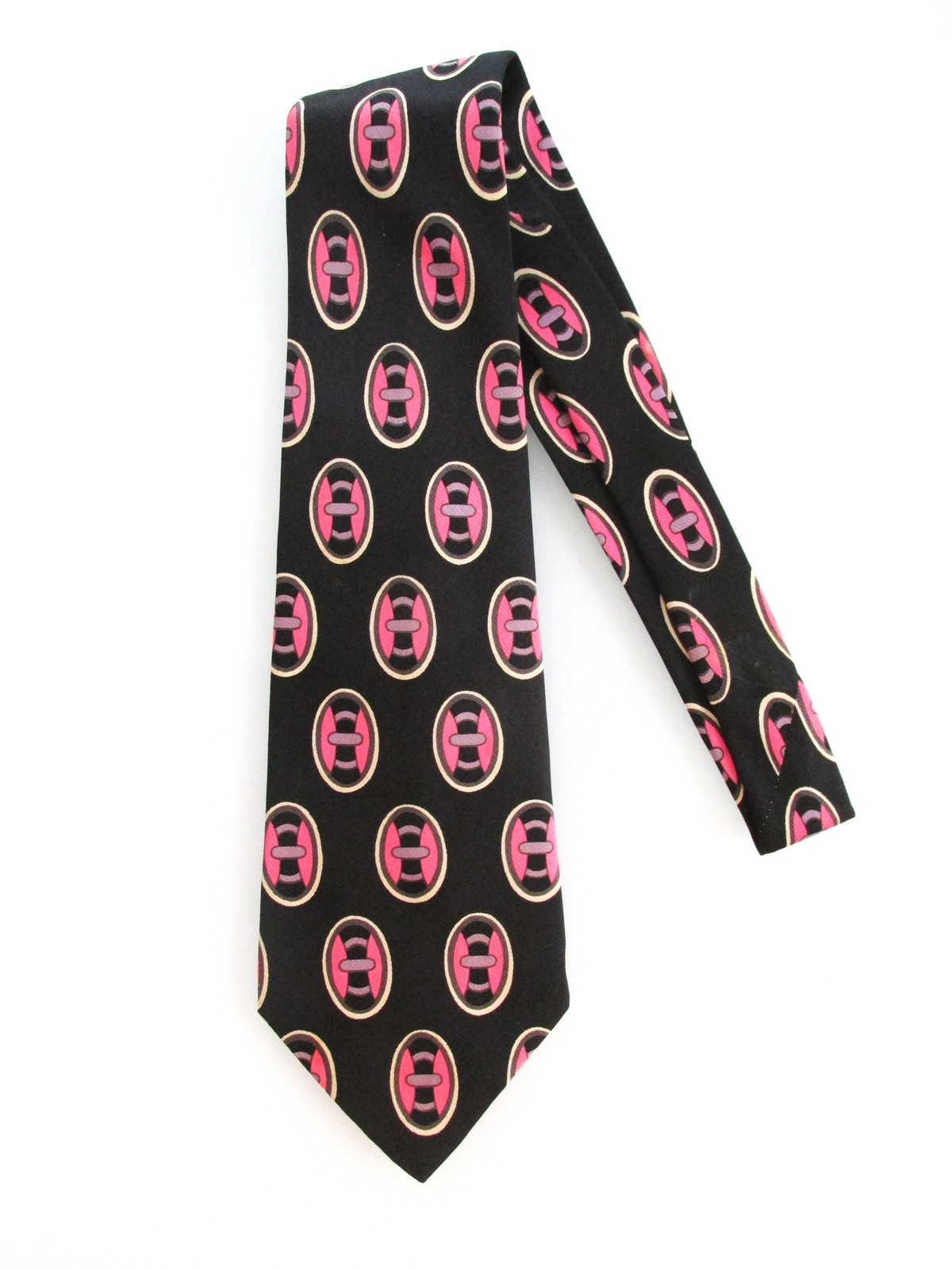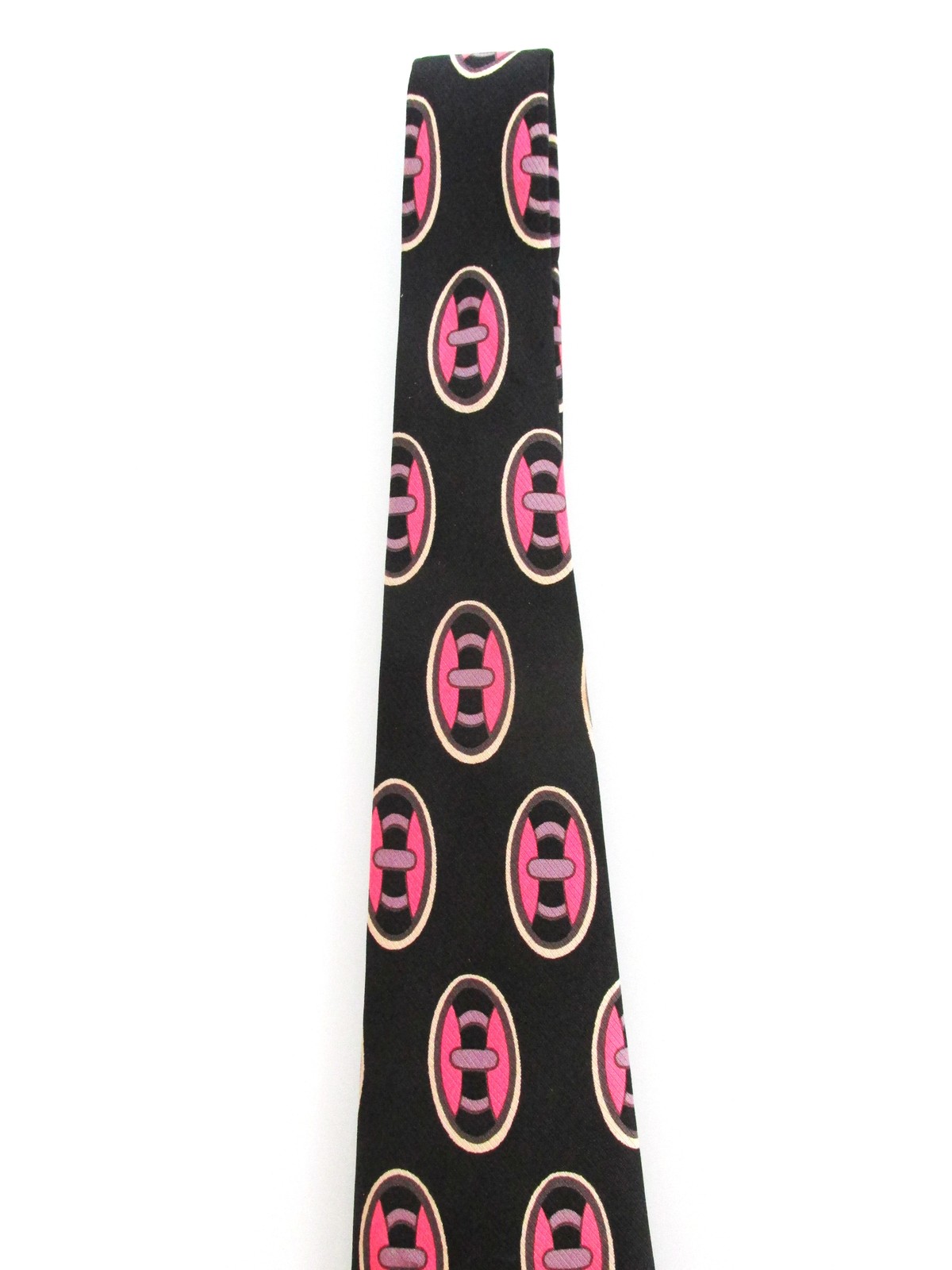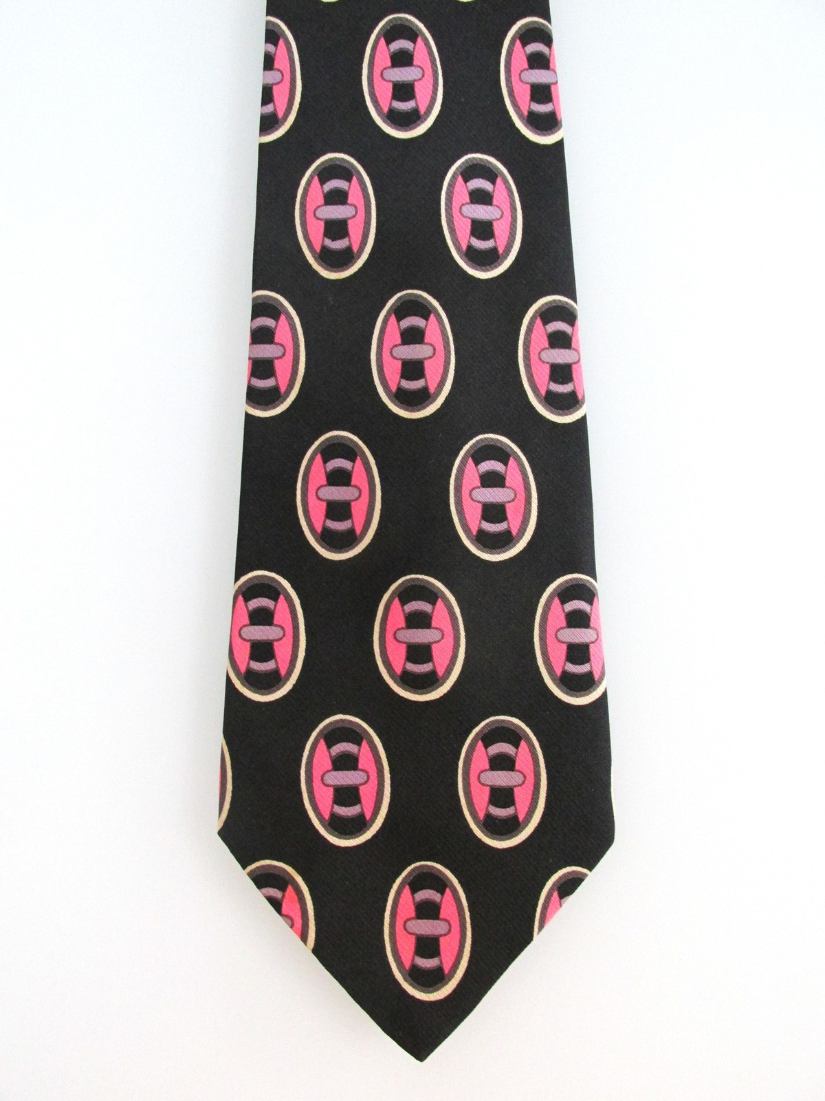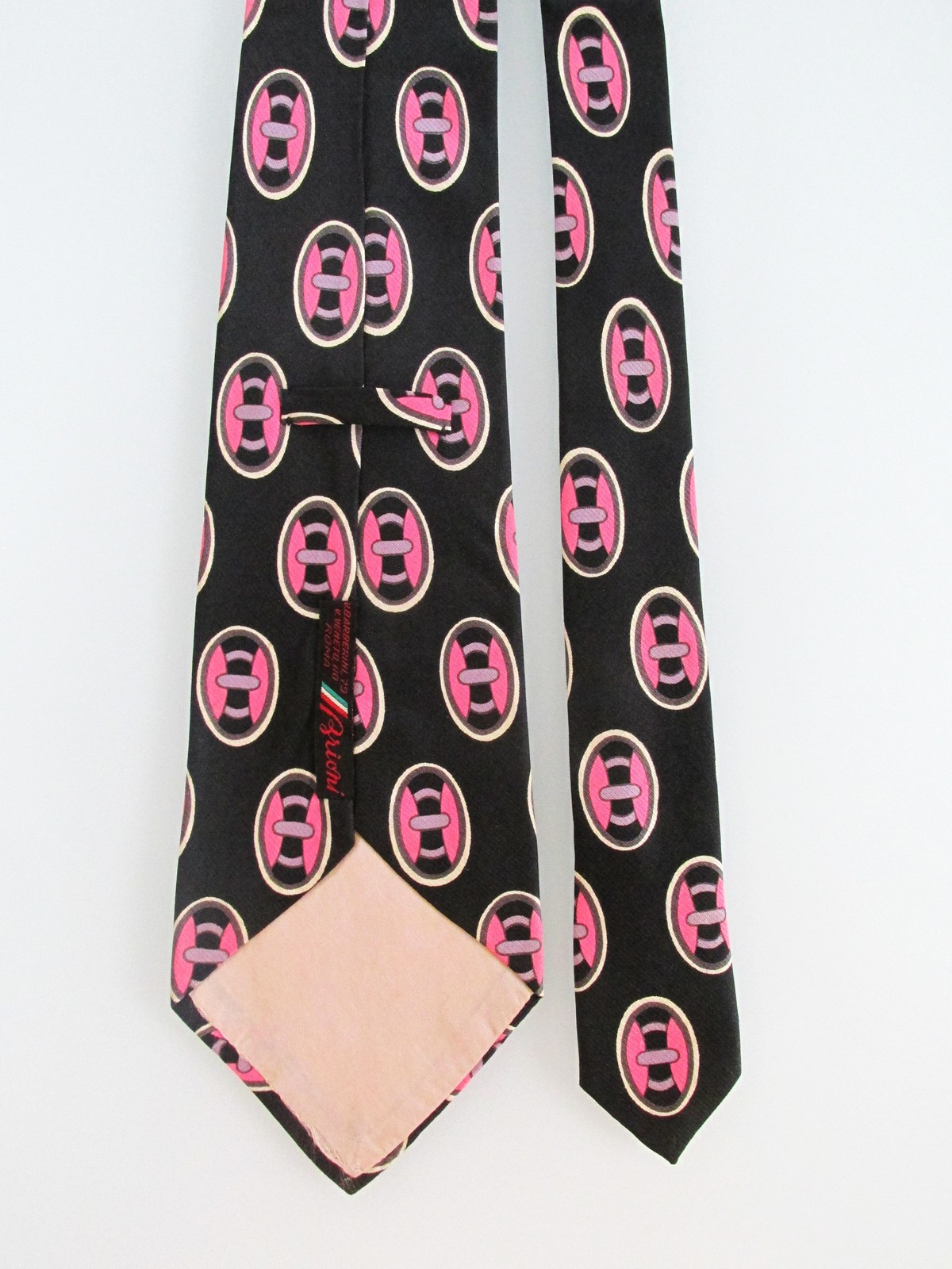 Description: Up for sale is a vintage designer men's silk tie by Brioni. The tie is handmade in Italy of 100% silk. The tie has a multicolored oval design in black, pink, purple white on a black background. The dimensions are 54" long x 4.25" wide. This tie is in perfect condition.