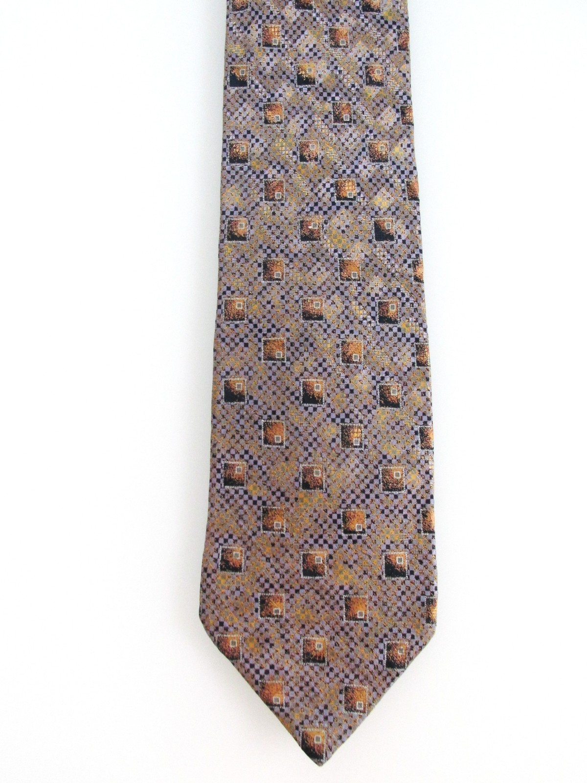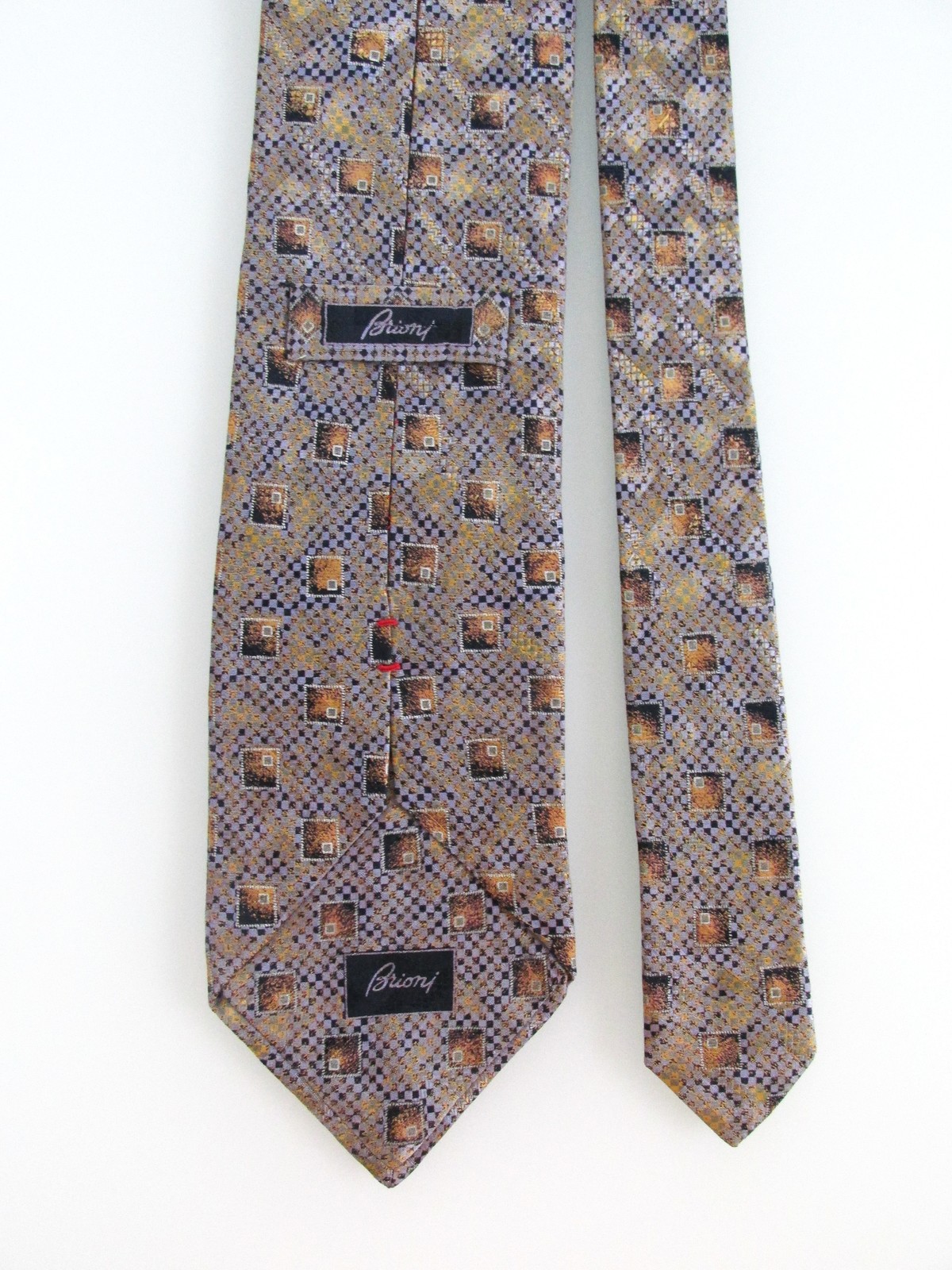 Description: Up for sale is a men's designer silk tie by Brioni. The tie is handmade in Italy of 100% silk. The tie has a multicolored contemporary design in bronze and gold on a light purple black tiny check background. The print number is B030355. This tie is fully lined. Dimensions are approximately 60" long x 3.75" wide. This tie is in excellent condition.