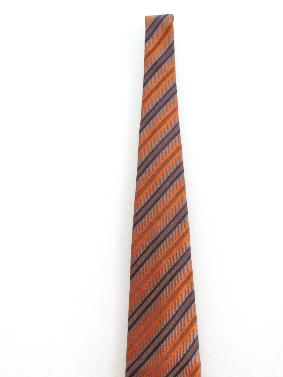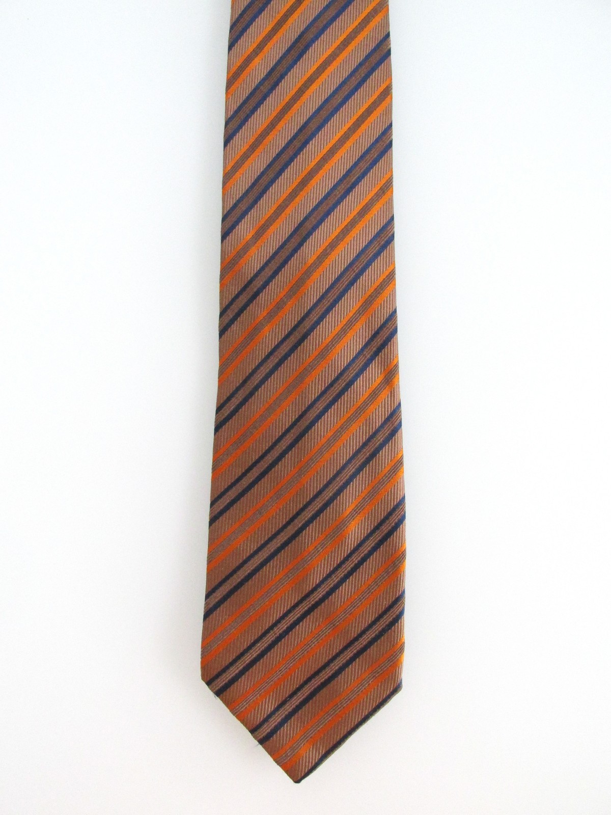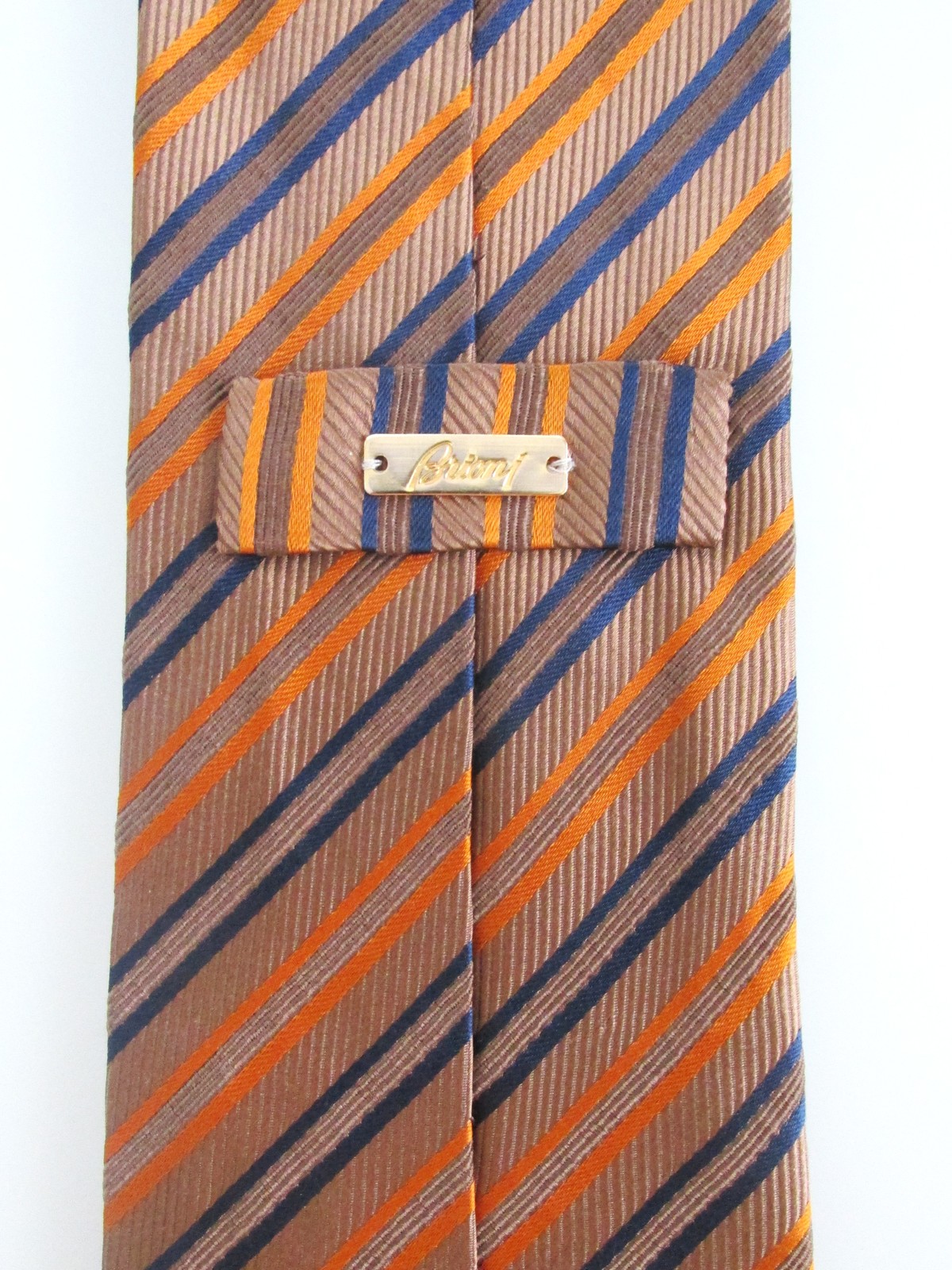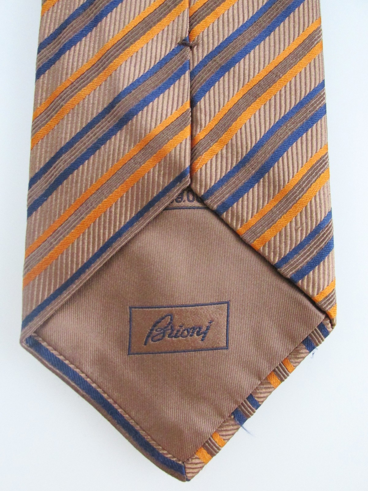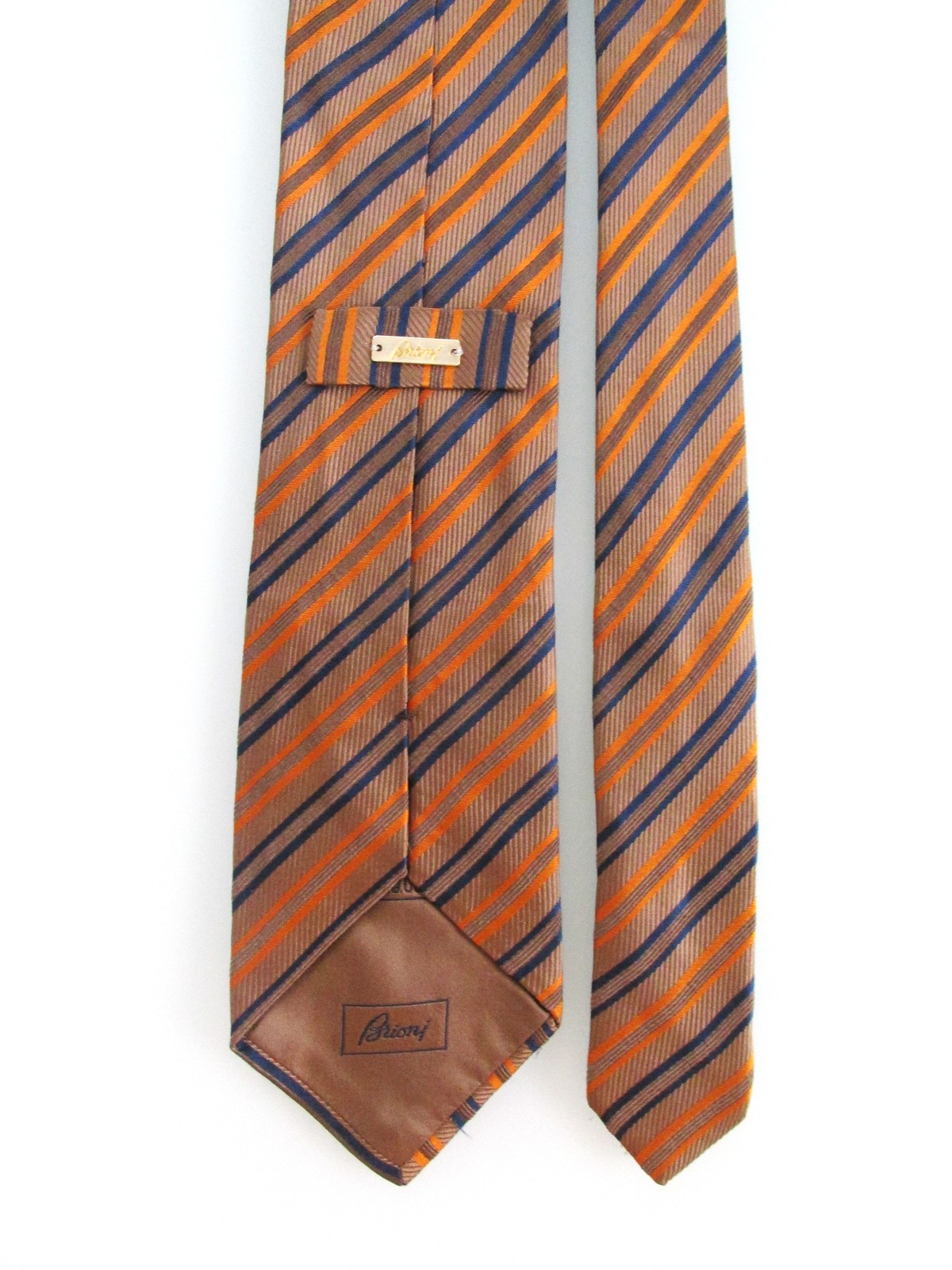 Description: Up for sale is a designer men's silk tie by Brioni. The tie is handmade in Italy of 100% silk. The tie has a multicolored striped design in orange, navy blue, and tan. The print number is B0080. The tie has the Brioni gold bar on the back. Dimensions are approximately 60" long x 3.50" wide. This tie is in excellent condition.
