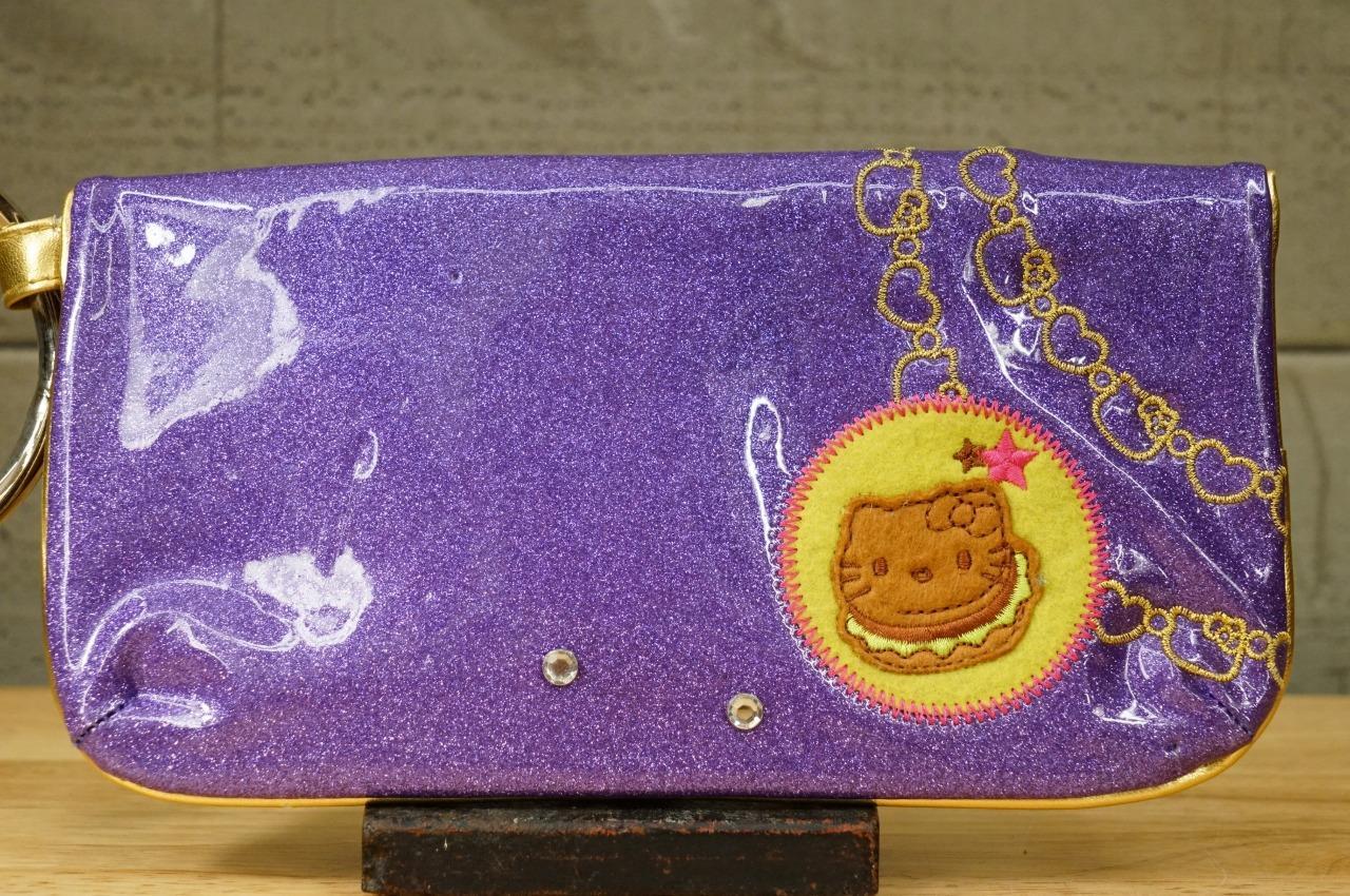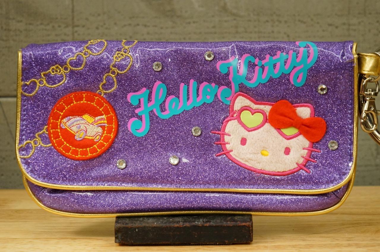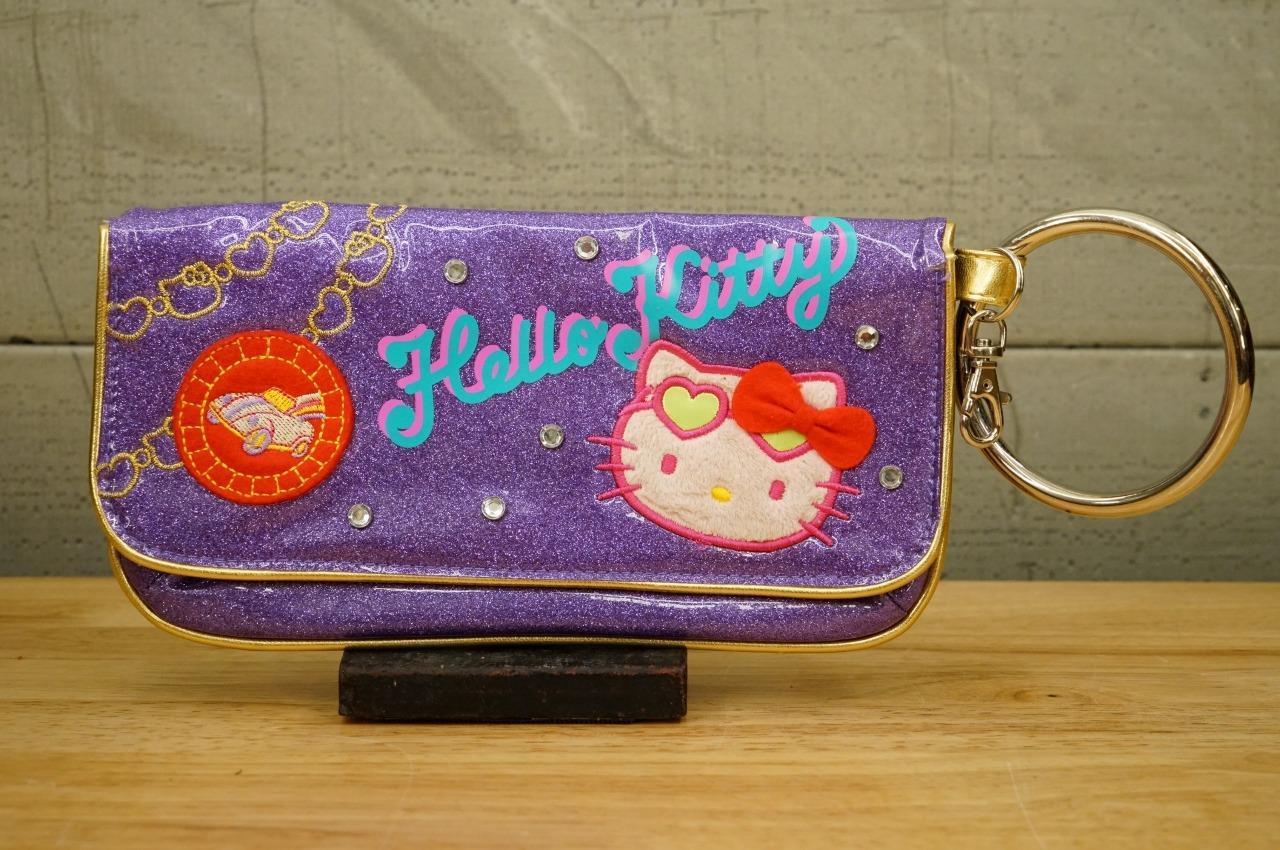 Vintage Hello Kitty Purple Sparkle Applique Rhinestone Clutch Purse Wristlet. Measures 10" long by 5.25" tall. Gold tone lame trim. The wristlet loop is silver tone metal. No smoke or pet odors.