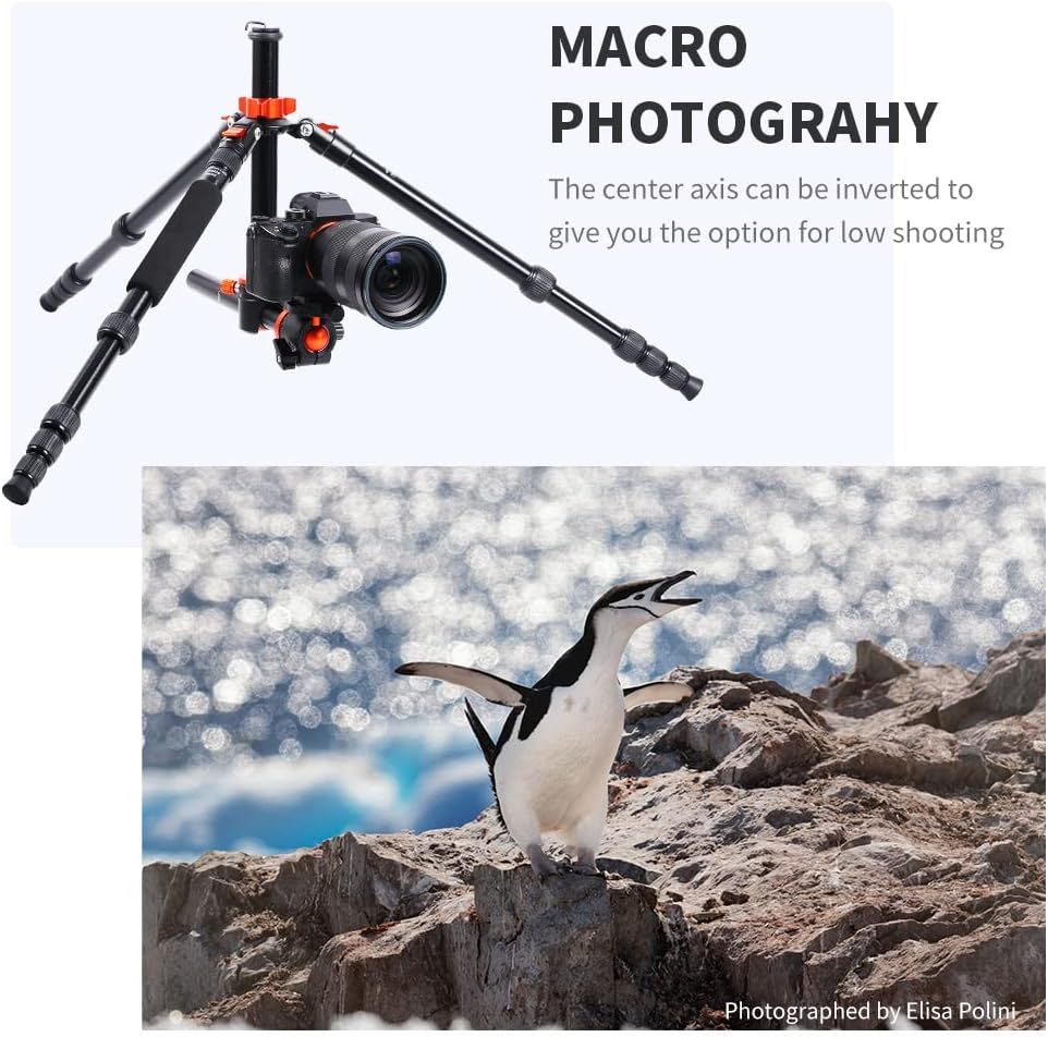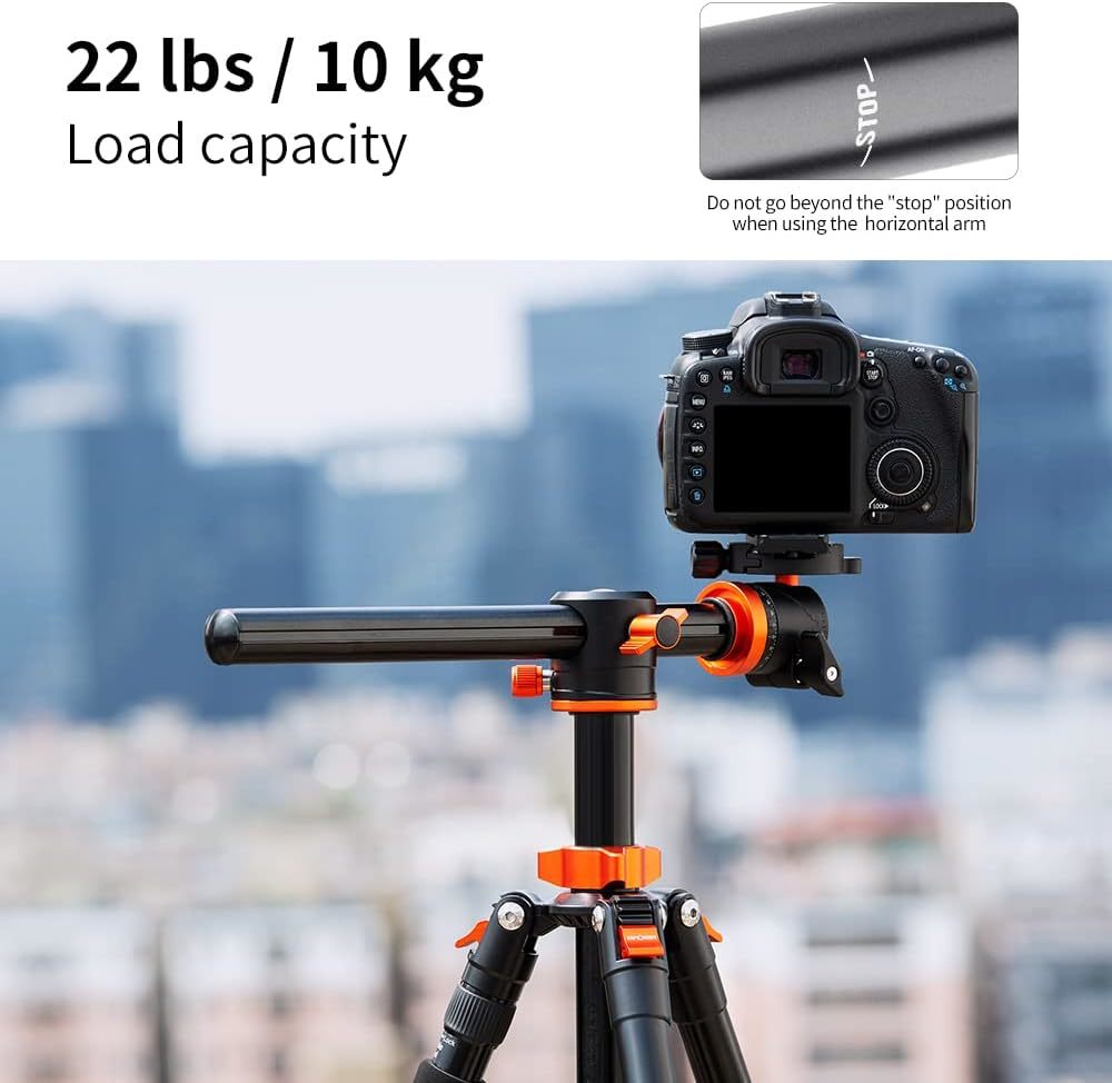 ?Transverse Center Column?Central column moves from 0 to 180 degrees, can be rotated 360horizontally, to realize panorama shooting. ?Strong Stability?25mm large diameter aluminum alloy tube,the load capacity can reach 22.04lbs (10kg), provide security and stability support for your dslr Canon Nikon camera. ?Compact Flexible?5 sections leg can adjust the height from 22'' to 67''; the N. weight with ball head is only 3.72lbs; can be 180reflexed, which is super portable with tripod carrying bag. ?Metal Ball Head?Can be rotated 360 degrees, helping to expand camera activity range when panoramic shooting.(the bubble level help to judge the level and the accurate composition) ?Detachable Monopod?It can be turned into a monopod or walking stick alone to make your photography more diverse. (Note: For camera with telephoto zoom lens, you need to buy a tripod mount ring additionally or telephoto lens bracket for better balance)