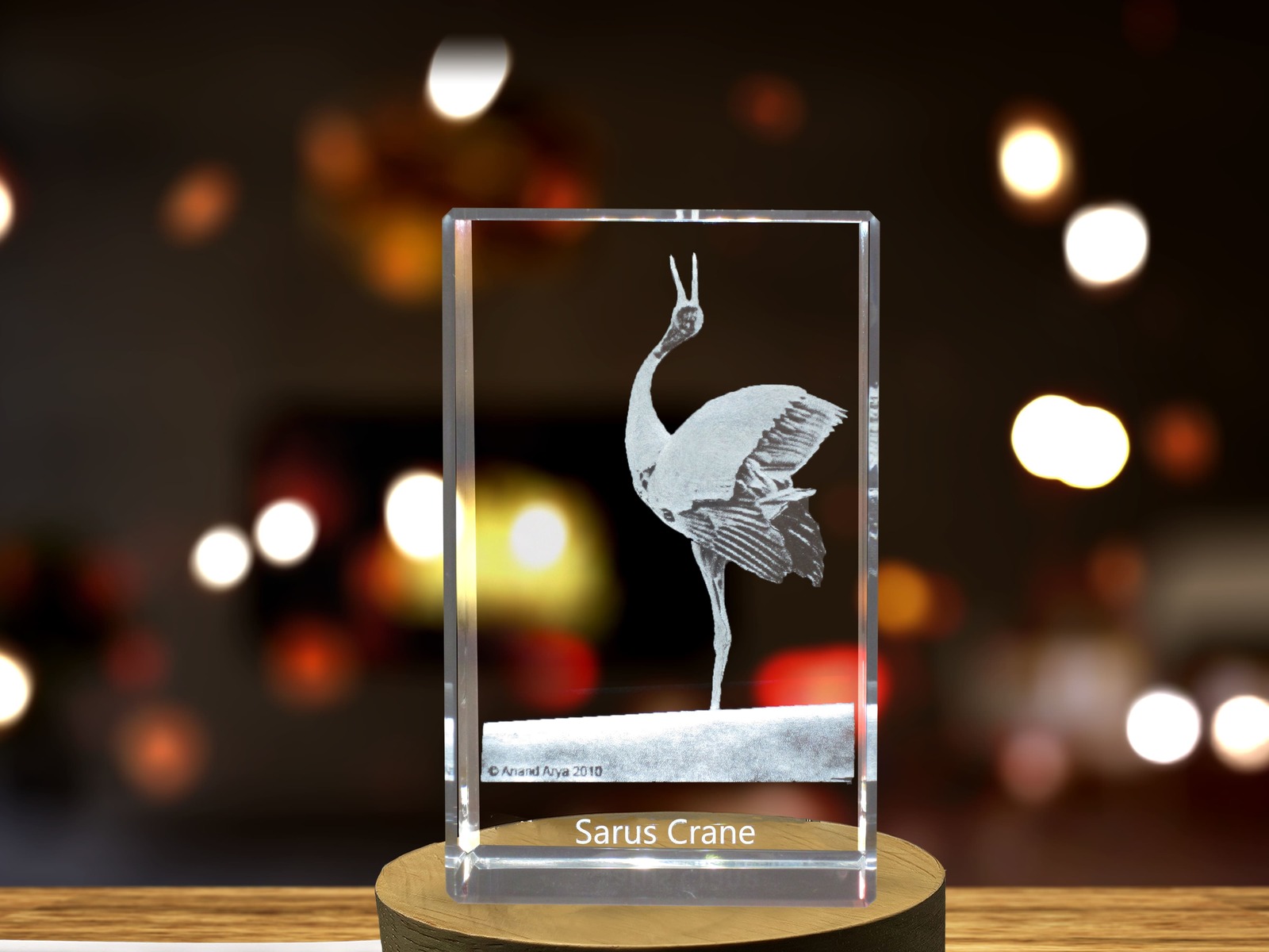 This unique crystal piece features a three-dimensional laser-engraved image of a Sarus Crane, a tall and stately bird found in South Asia and Australia.