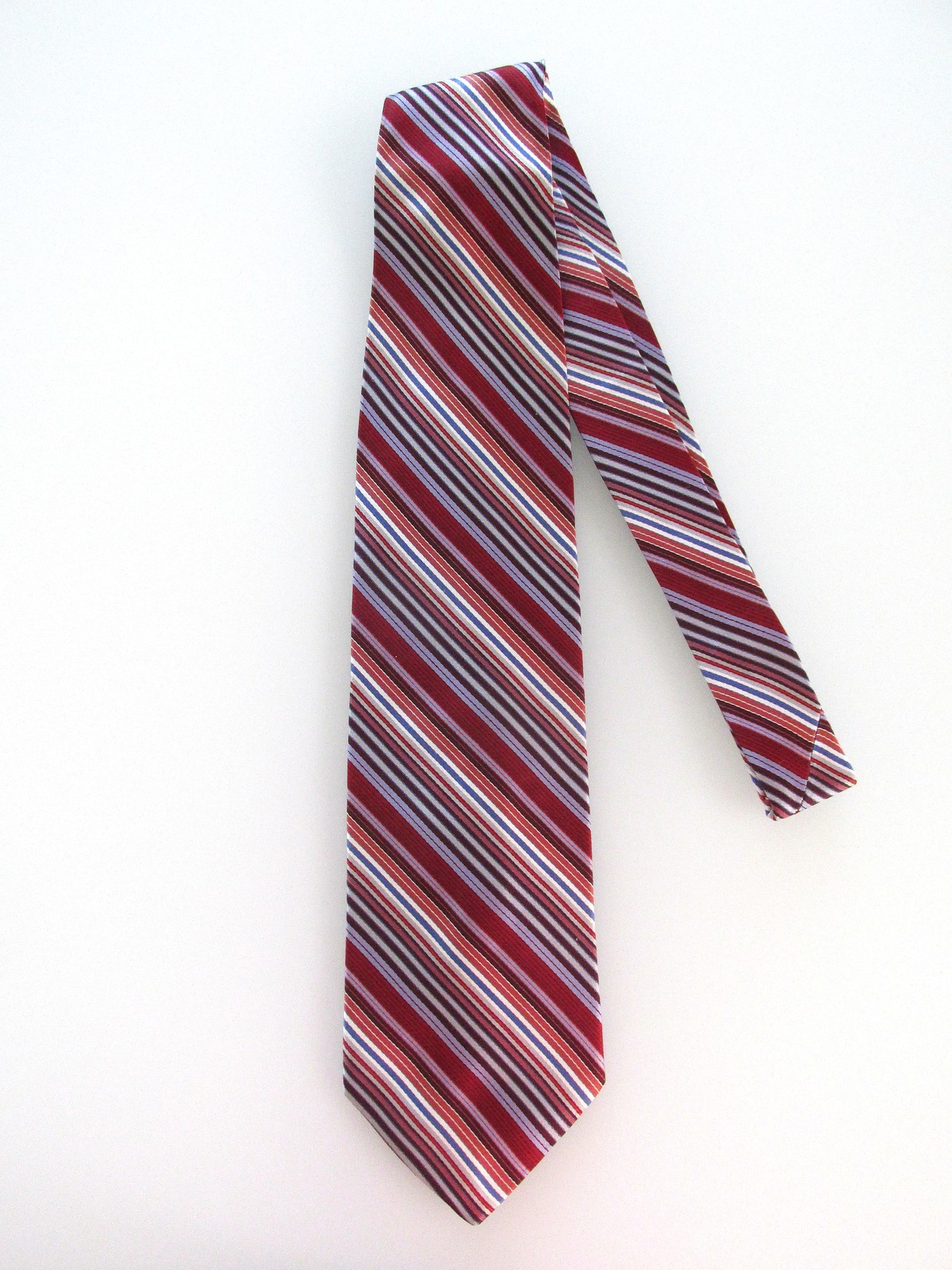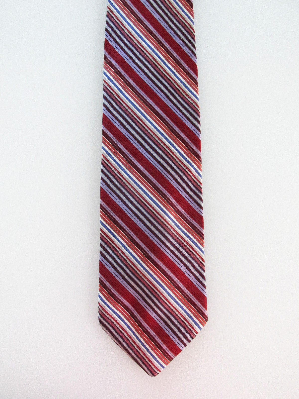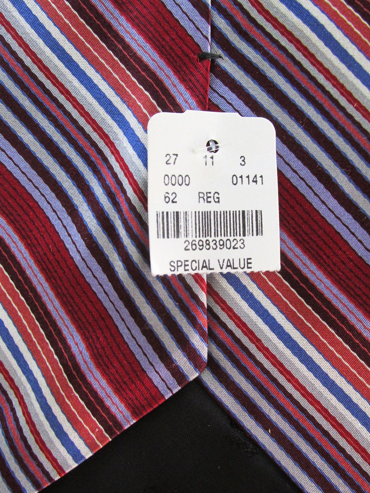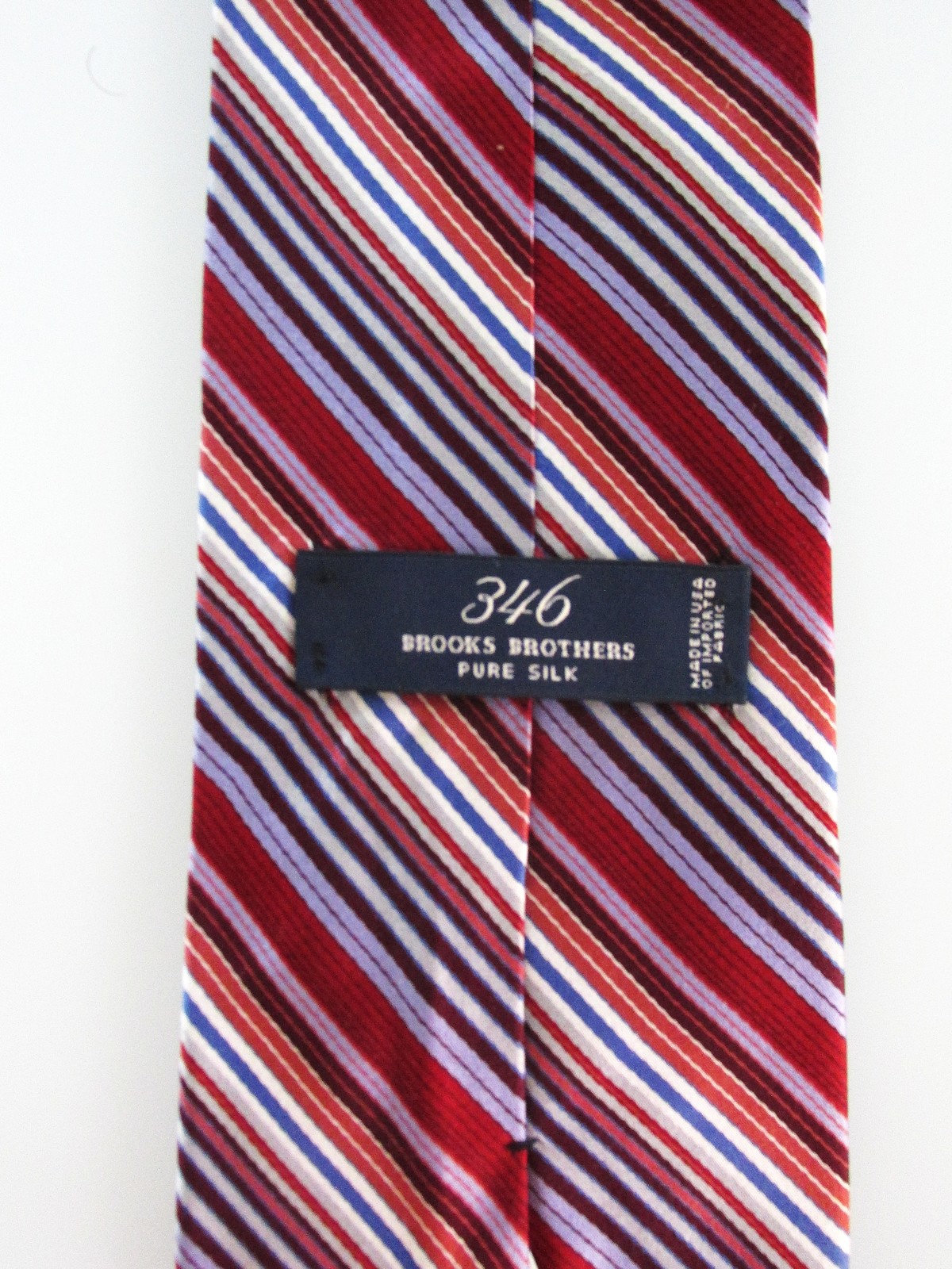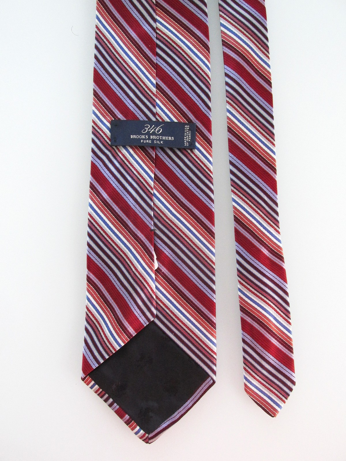 Description: Up for sale is a Brooks Brothers (NWT) men's silk tie. The tie is handmade in the USA of 100% silk. The tie has a multicolored striped pattern in shades of red, white, lavender, copper, and gray. Dimensions are approximately 59" long x 3 5/8" wide.