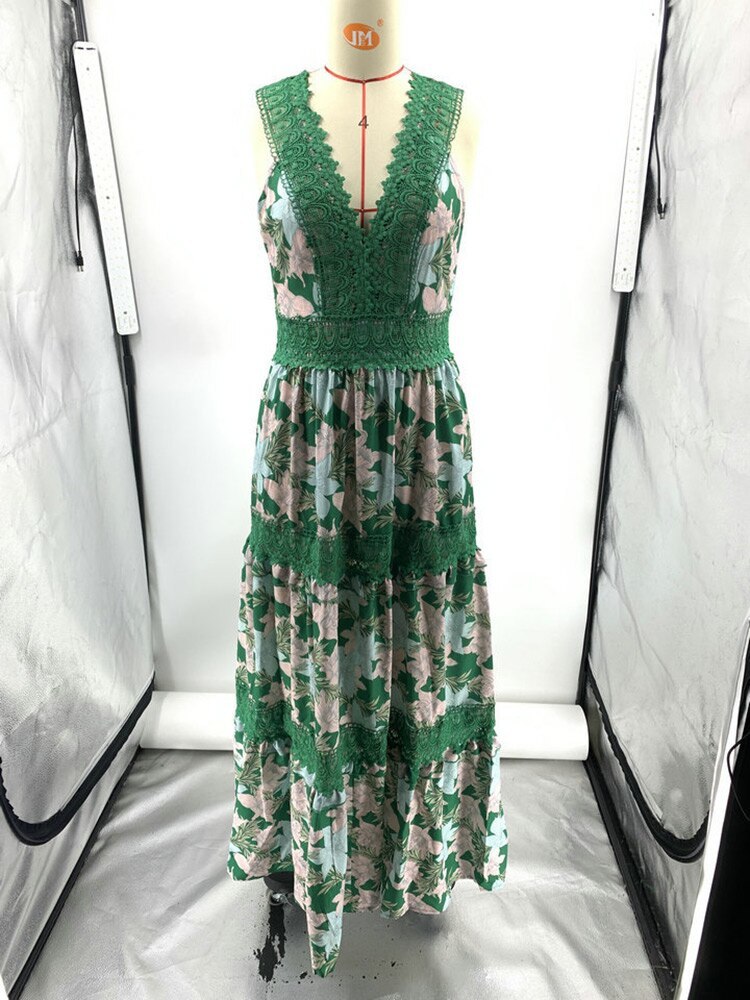 Summer Fashion V-neck Sleeveless Lace Spliced High Waist A-line Maxi Dress