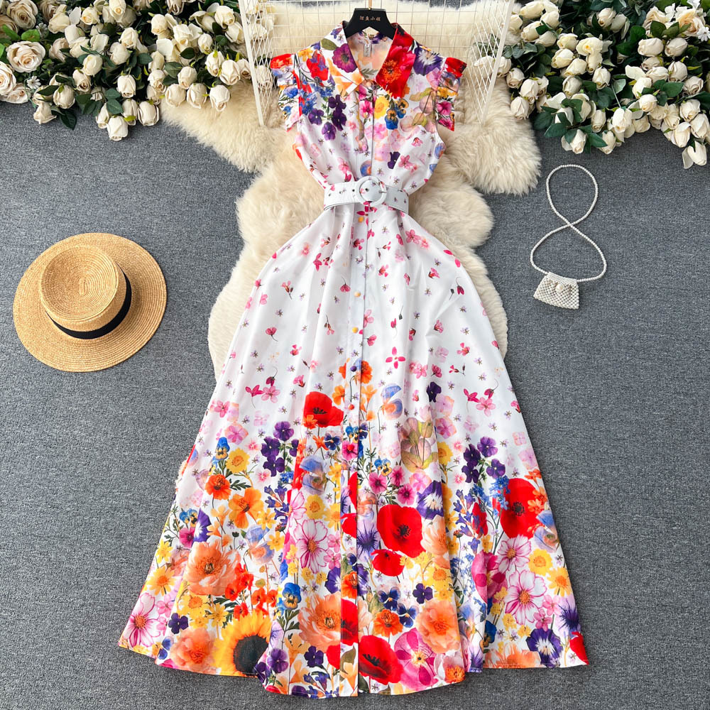 Summer Sleeveless Ruffles Single Breasted High Waist Belt Floral Print Maxi Dres